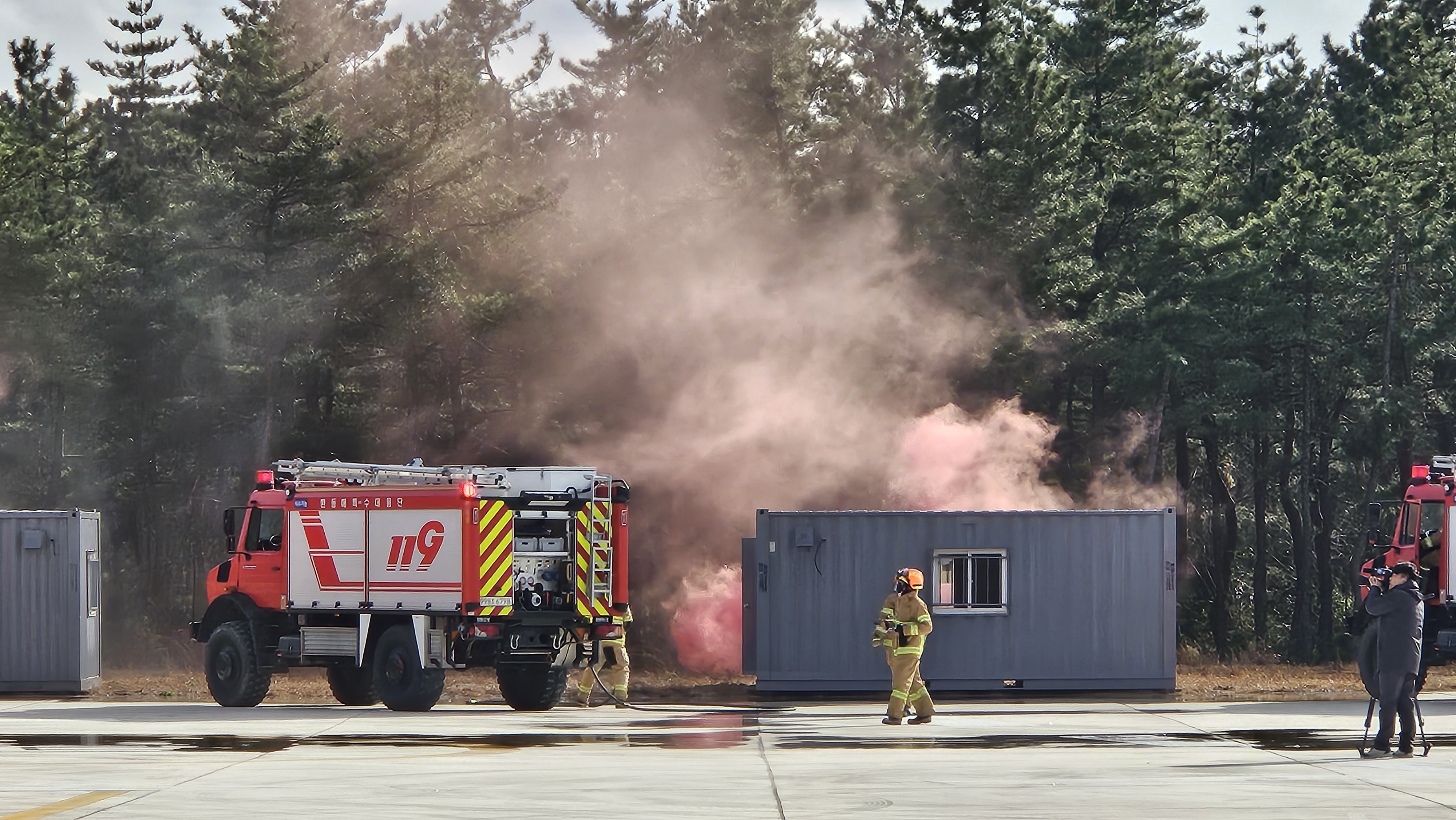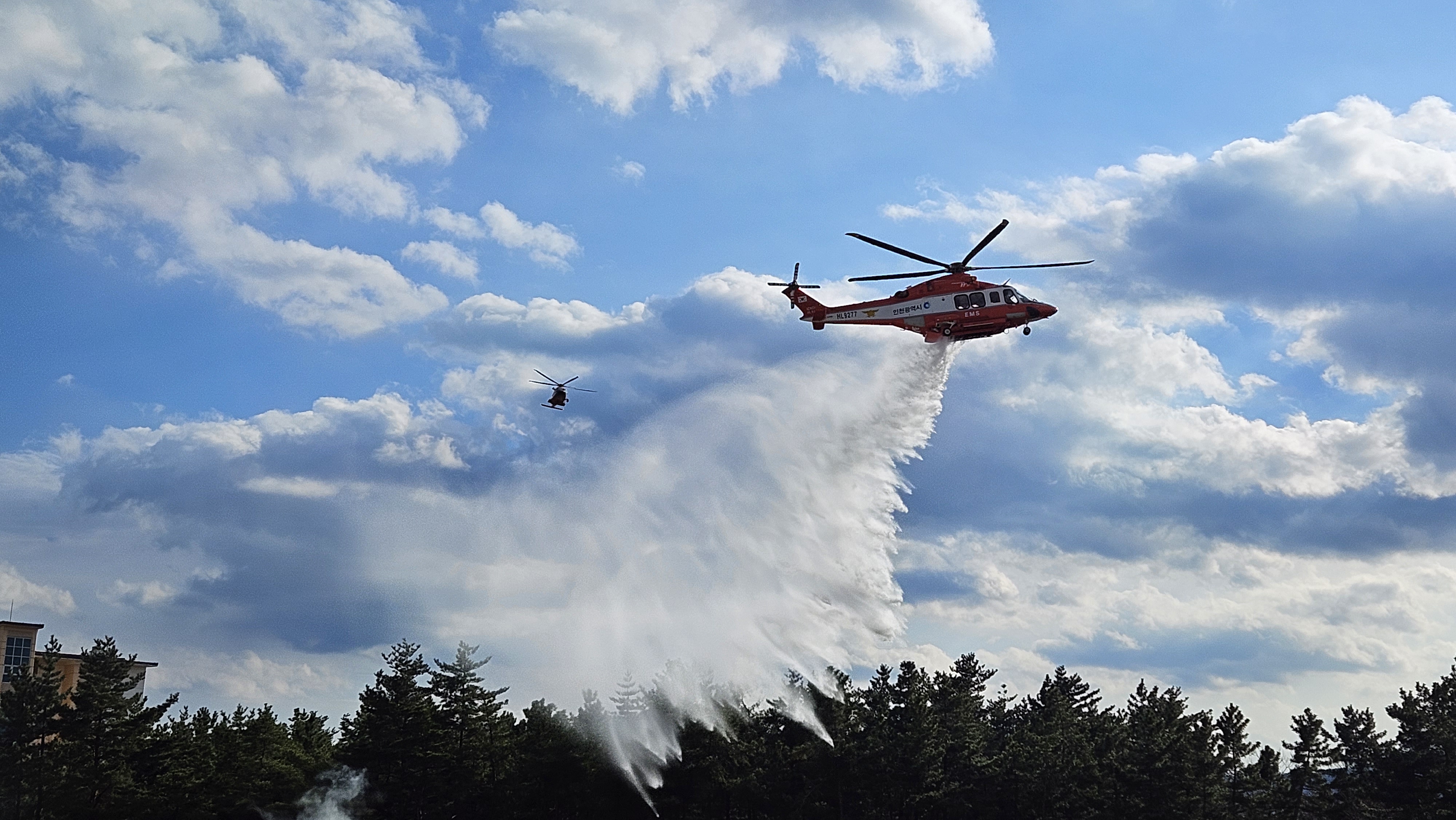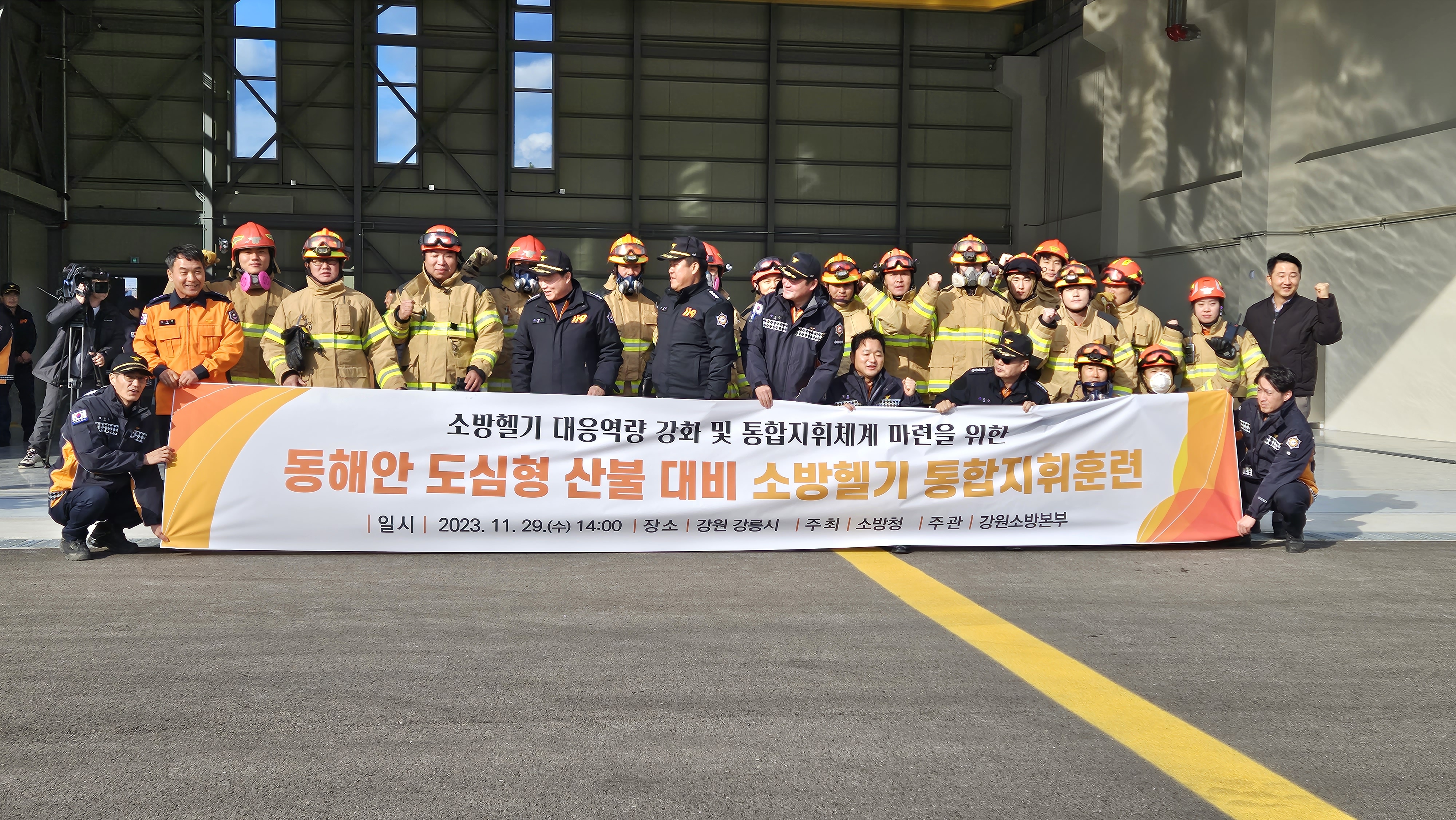 금일 소방청 및 강원특별자치도 소방본부에서 주관하는 재난대비 소방헬기 통합지휘 훈련이 공군 18전투비행단 인근에서 시행됐습니다.
