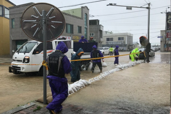 거진남성의소대원 10명이 지원에 나서 거진터미널, 전통시장 등에 모래마대를 설치 및 토사제거 활동으로 복구를 지원했다.