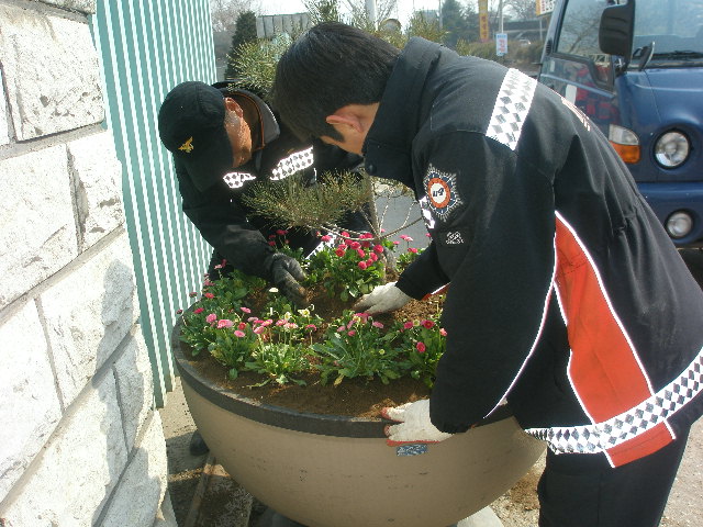 소방서 정문 화단에 꽃 심었습니다.