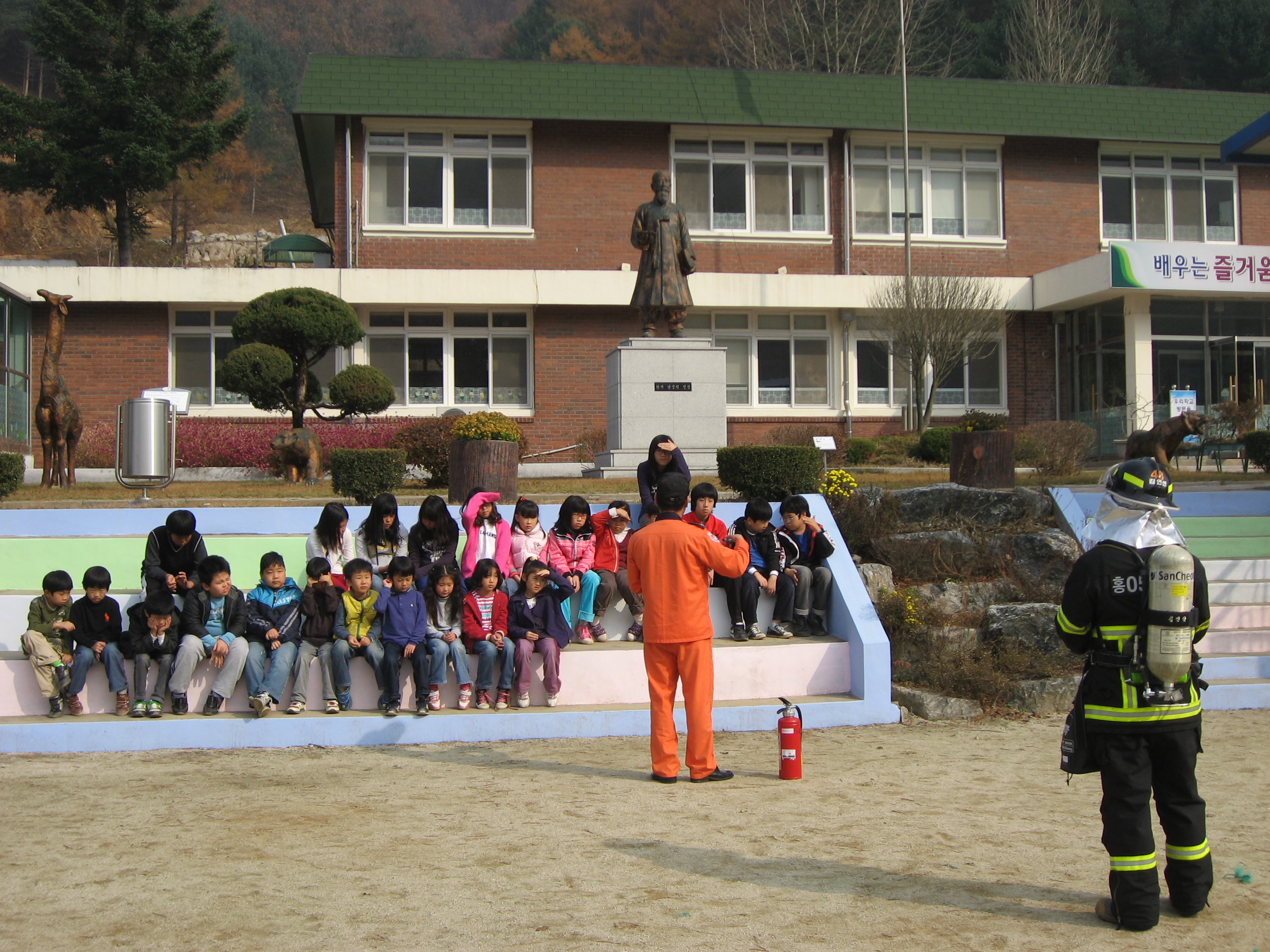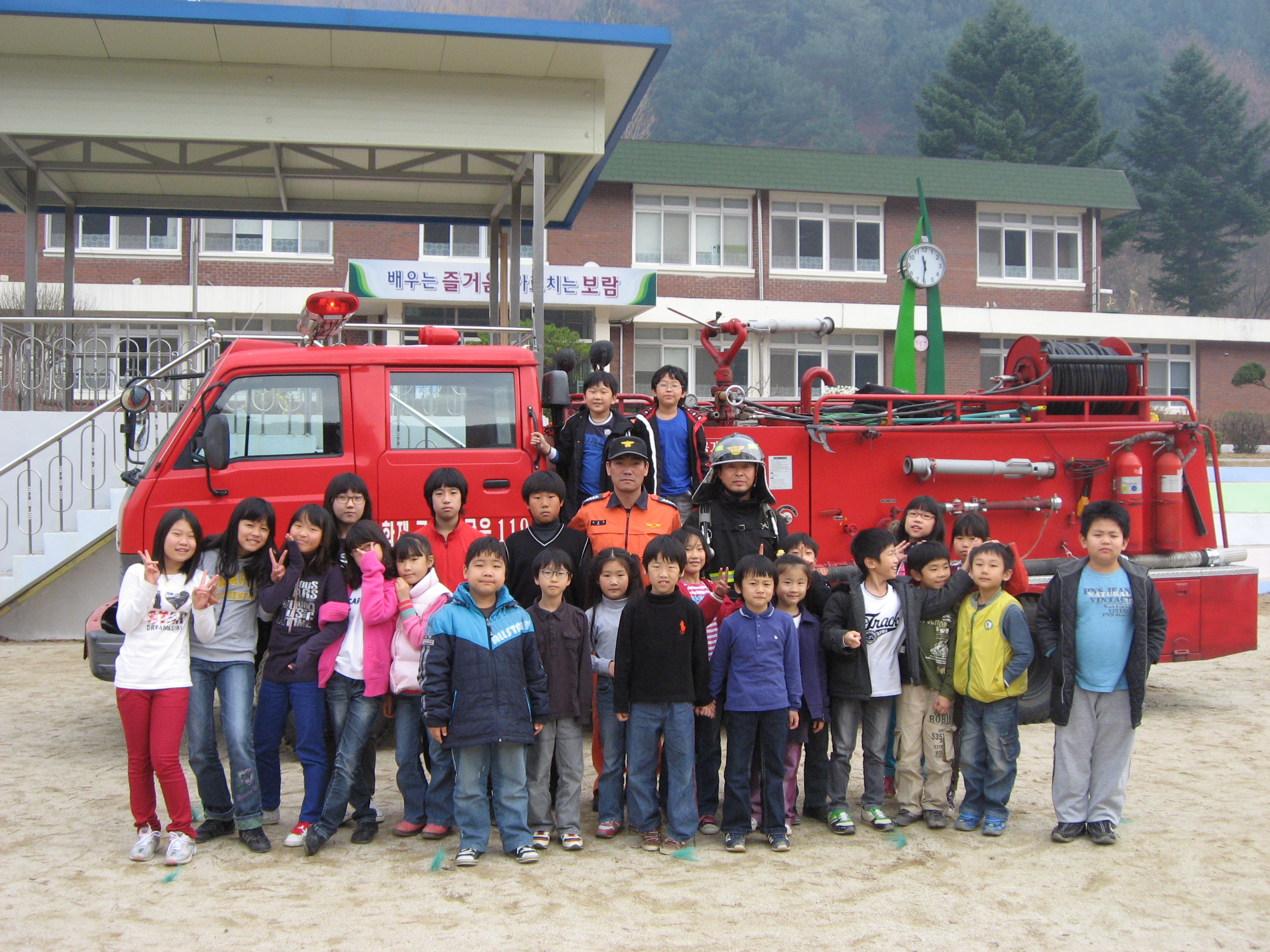 운동장에 불을 피워서 직접 진압하는 훈련을 해보았는데 불을 보고 즐거워하던 아이들이