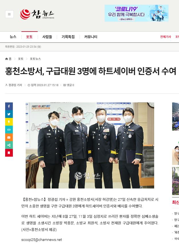 홍천소방서(서장 허강영)는 1월 27일 신속한 응급처치로 시민의 소중한 생명을 구한 구급대원 3명에게 하트세이버 인증서와 배지를 수여했다.