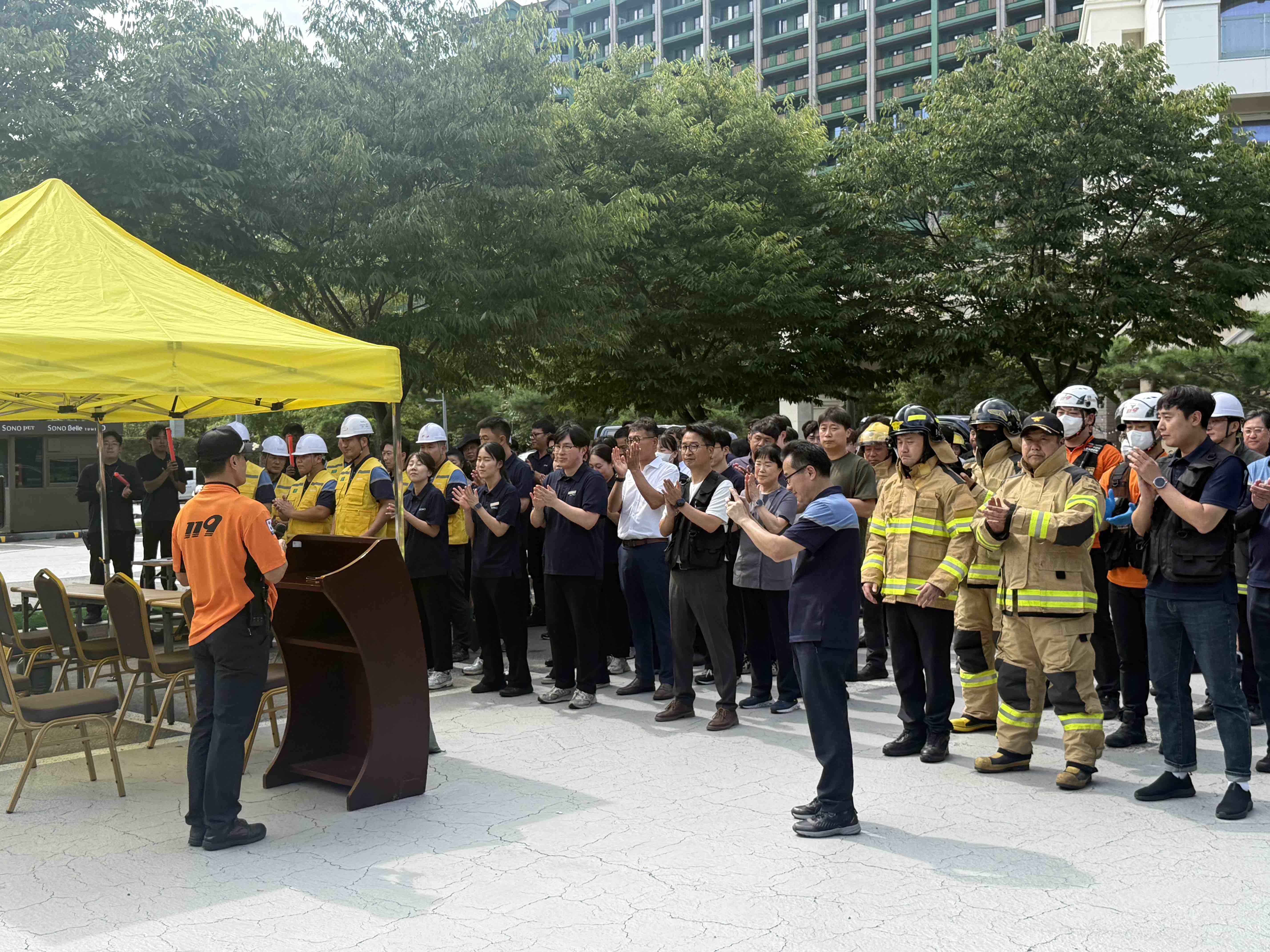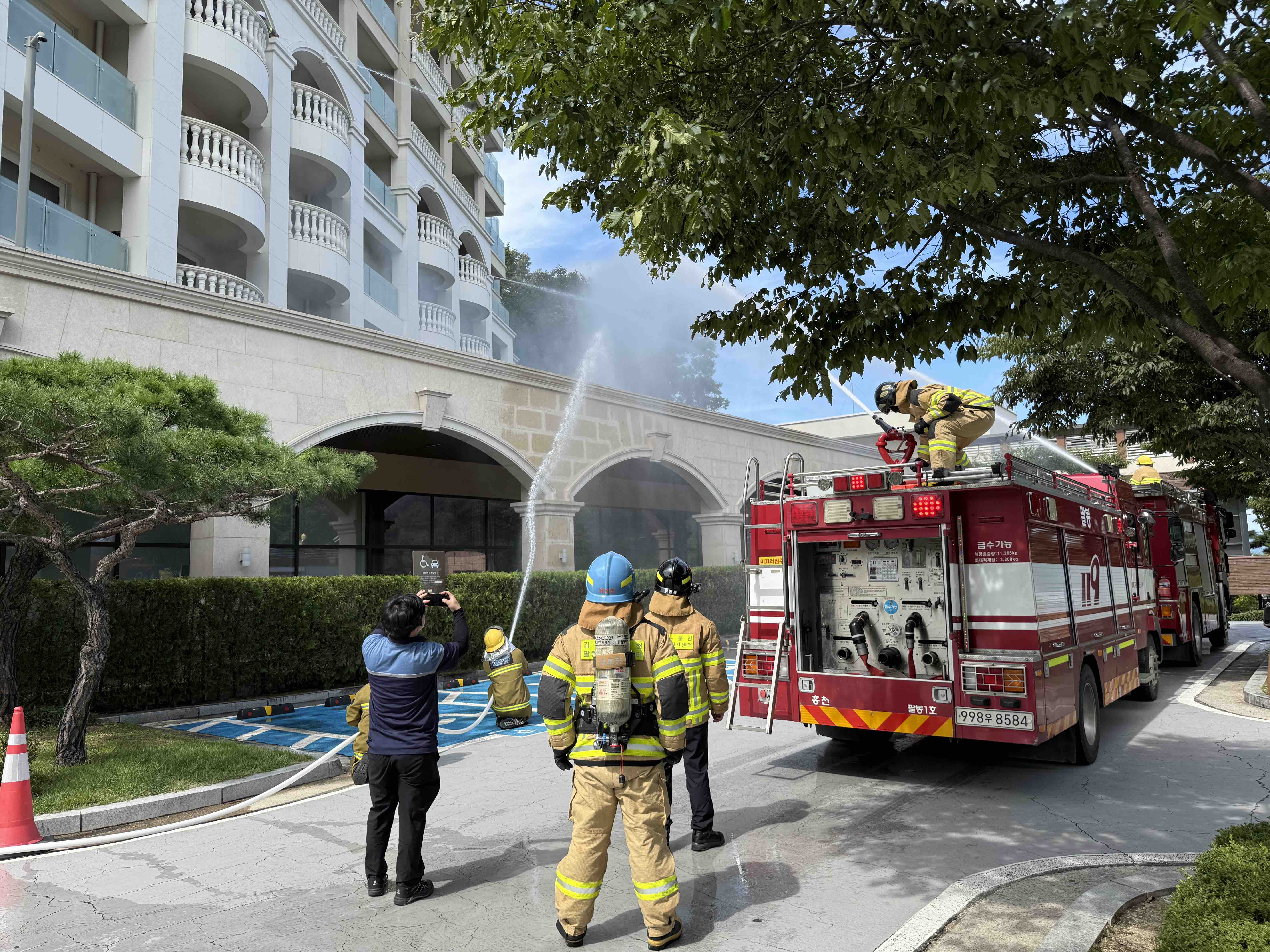 훈련은 ▲의심 가방 발견 및 폭발 상황 가정 ▲119신고 및 유관기관 전파 ▲투숙객 및 직원 대피 유도 ▲자위소방대 초기 소화활동 ▲응급환자 현장 응급처치 ▲소방대 합동 방수 및 화재 진압 ▲시설 복구 정상화 순으로 진행됐다. 특히, 실제 현장 여건을 반영한 훈련 시나리오를 적용해 훈련 참가자들의 긴장감과 집중도를 높였다.