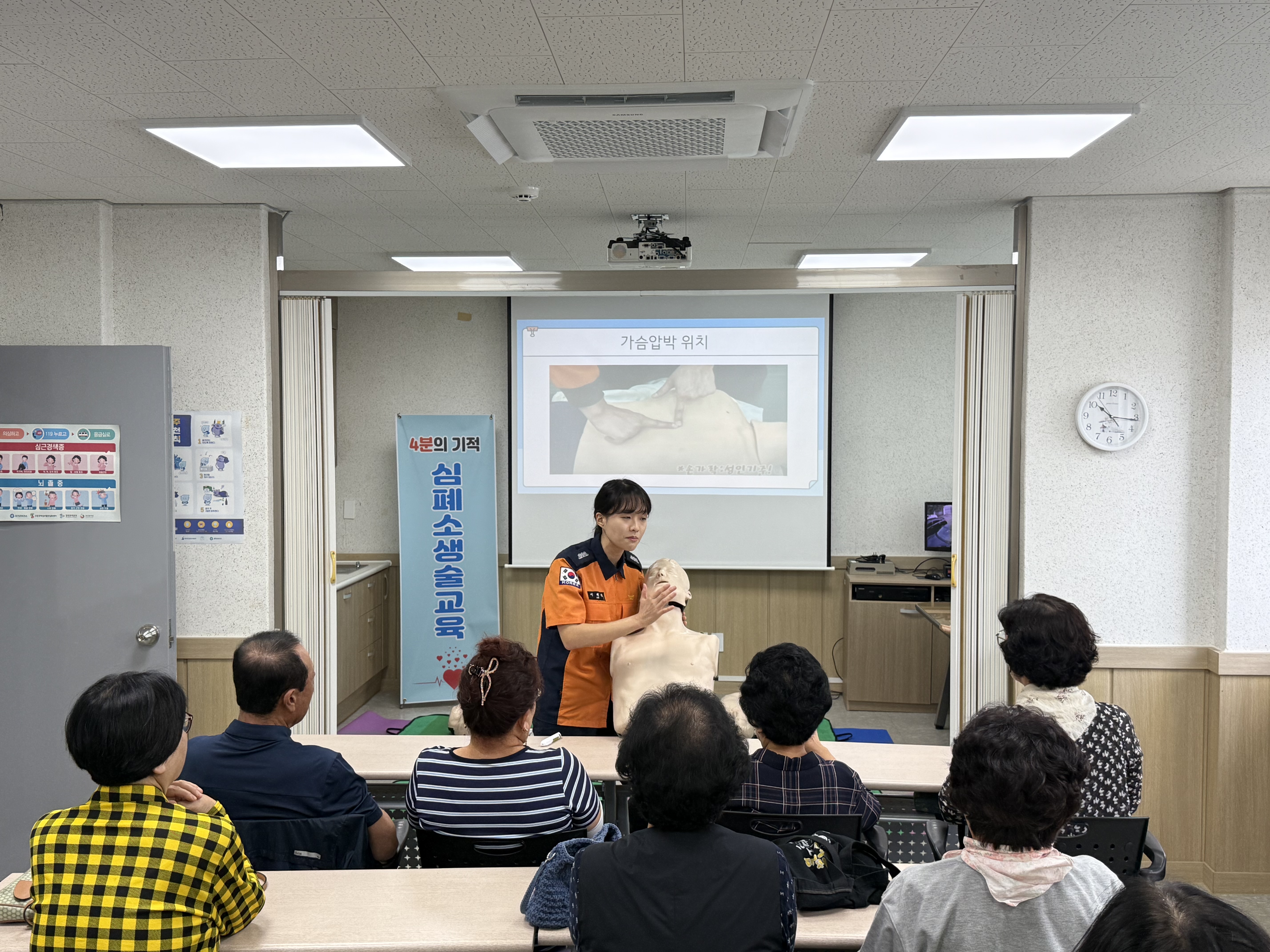 교육 진행은 홍천소방서 이혜림 소방교가 진행하며 교육 내용은 ▲심폐소생술(성인,유아) 이론 및 실습 ▲하임리히법 등 생활 속 응급처치 ▲자동심장충격기(AED) 사용법 등 실습 중심으로 구성됐다. 아울러 강원특별자치도 소방본부가 기획한 ‘강원아리119 체조’를 함께 실시해 주민들의 적극적인 참여를 이끌었다.
