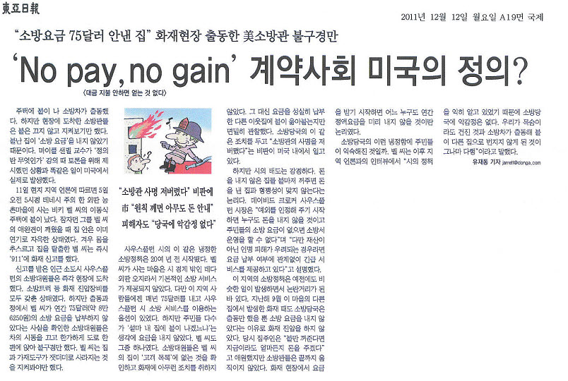 "소방요금 안낸 집" 화재 현장에서의 미국 소방관(동아일보)