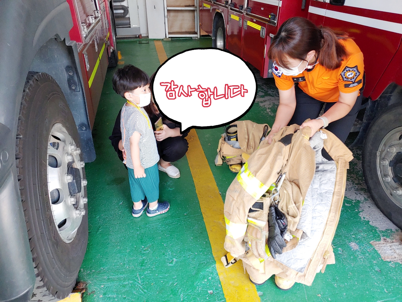 그래서 주차장에서 최대한 방해 안하려고 먼발치에서 보면서 아쉬움을 달래고 있던 중 마침 주차장에 계셨던 최현주 소방관님이 먼저 다가오셔서 소방차와 구급차에 대해서 친절하게 설명해주시고 보여주시기도 해서 정말 뜻 깊은 시간 보내고 왔습니다