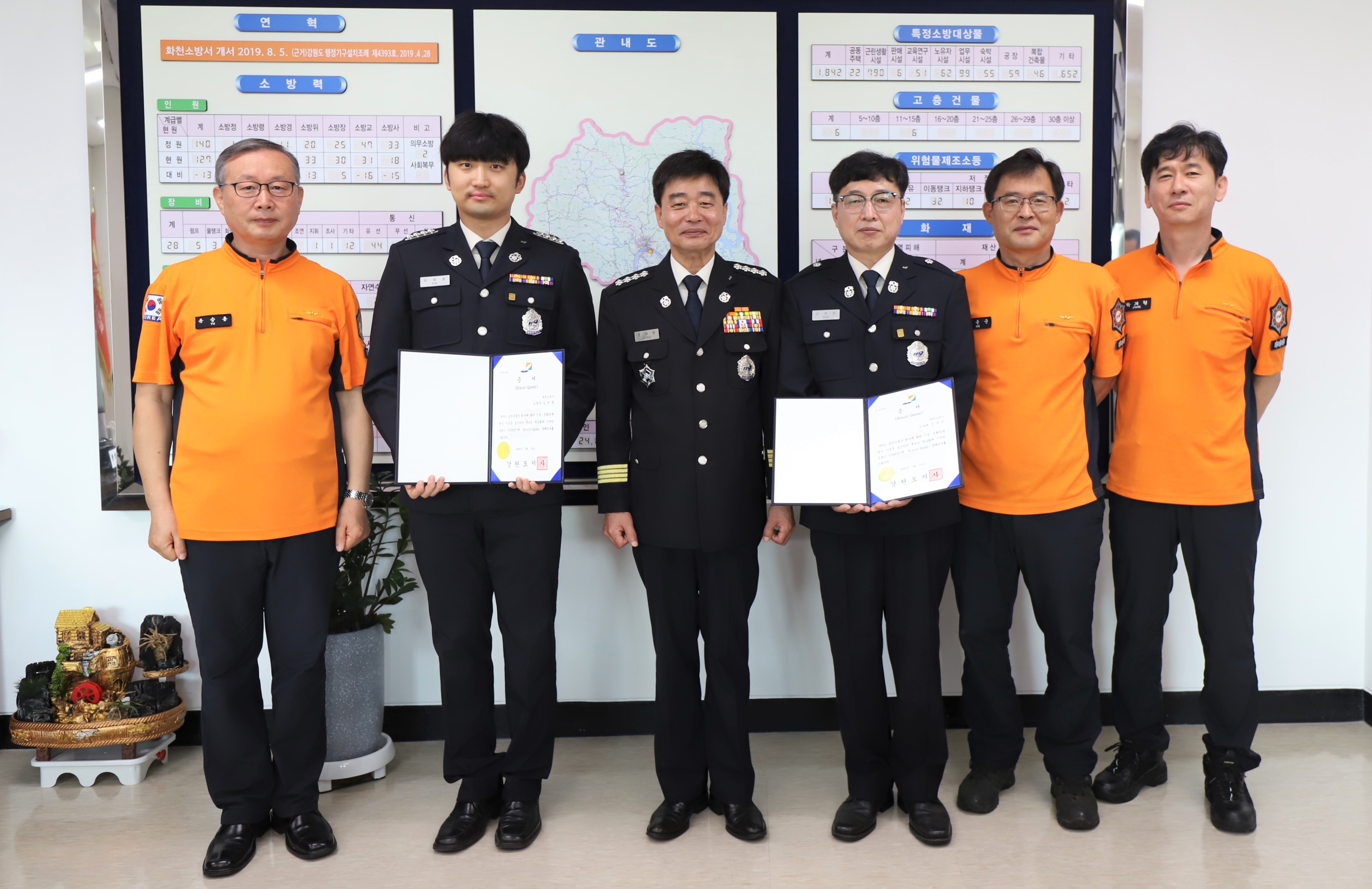 신준민 소방위와 김영훈 소방장에게 브레인세이버 인증서와 배지를 수여했다.