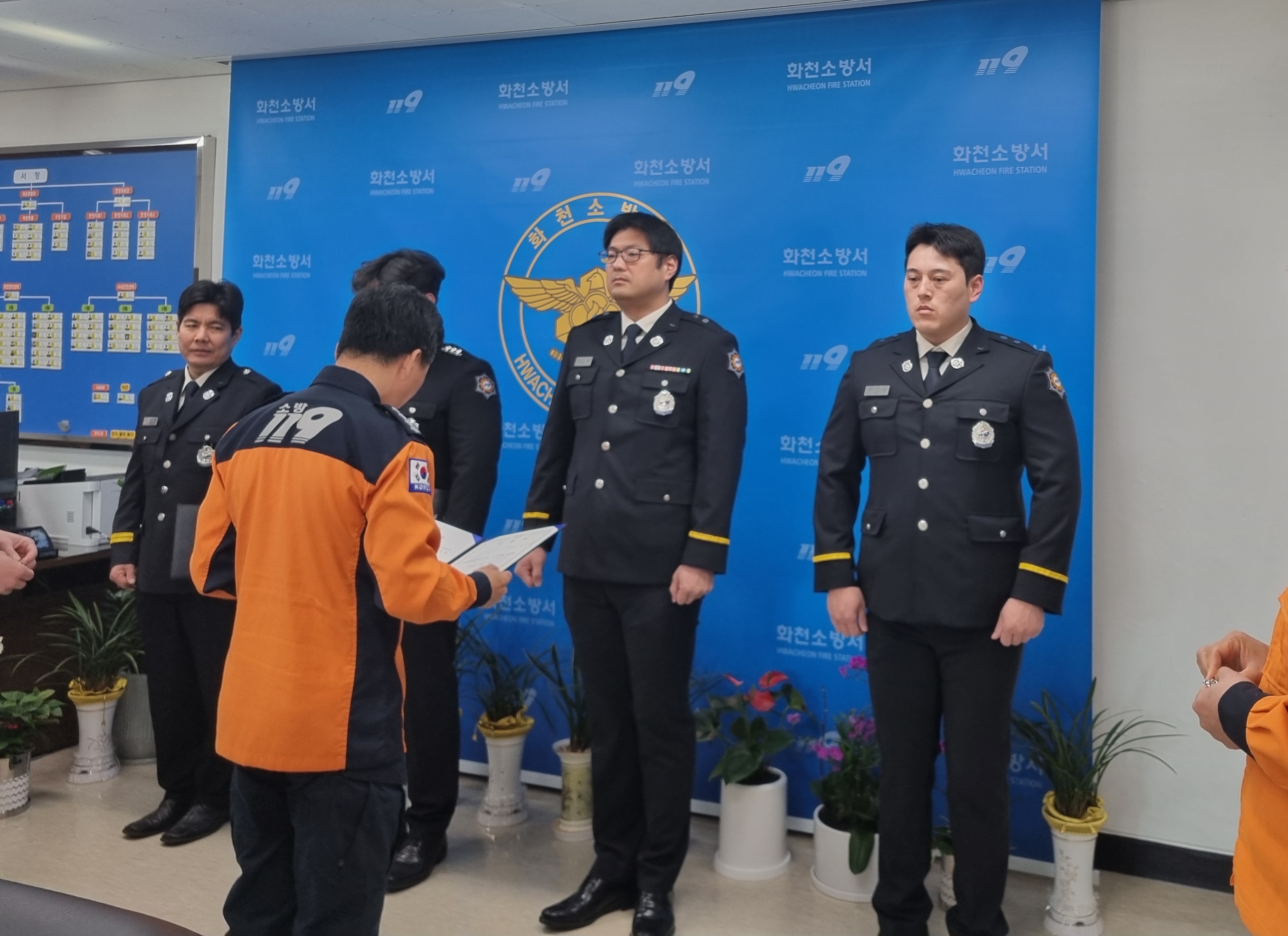 이날 수여식은 소방위ㆍ소방교 근속 승진 대상자 4명에 대해 진행됐다. 최임수 서장과 각 과ㆍ단장이 참석한 가운데 임용장을 수여하고 차담회를 통해 축하와 격려를 하는 시간이 마련됐다.