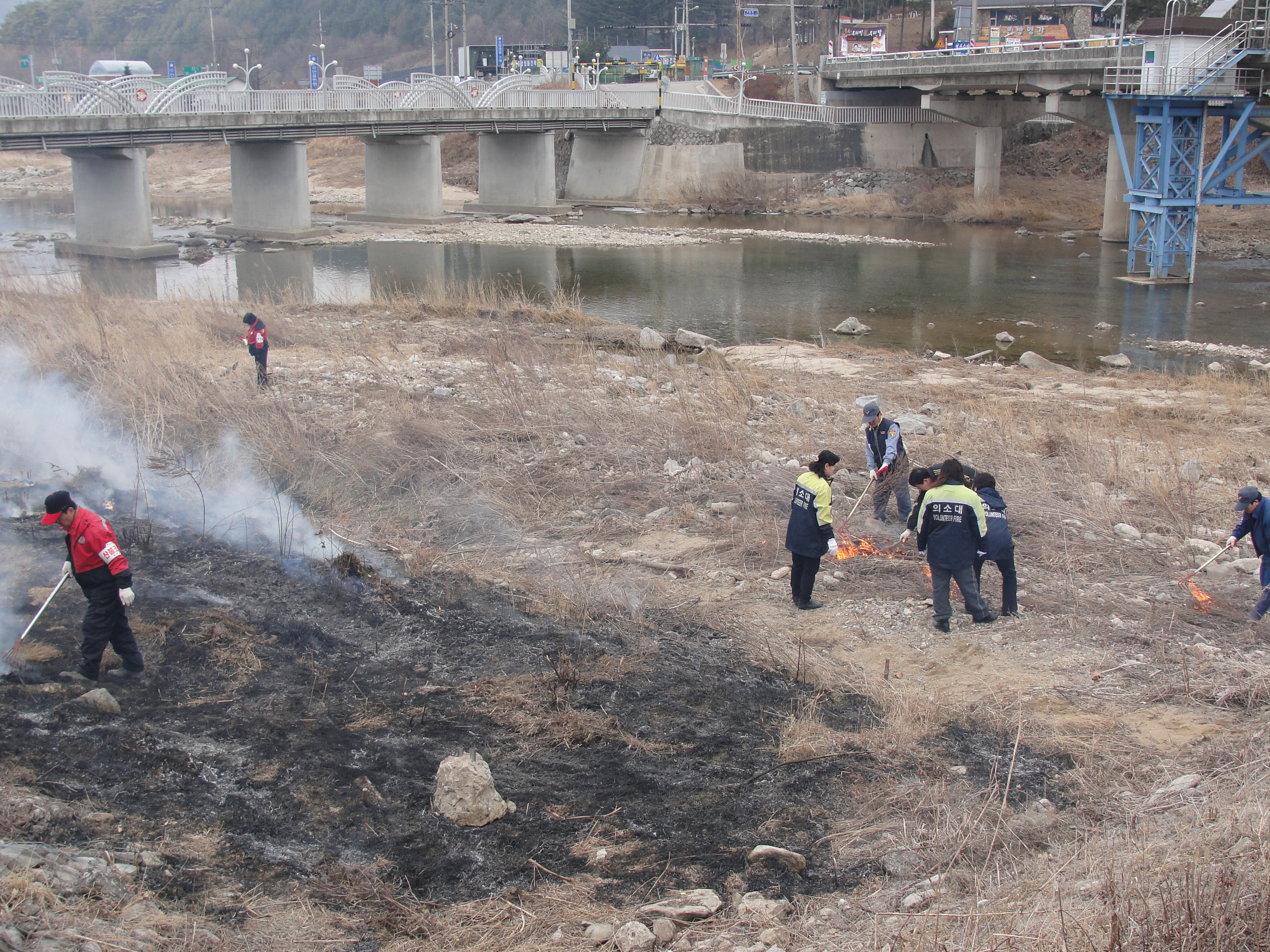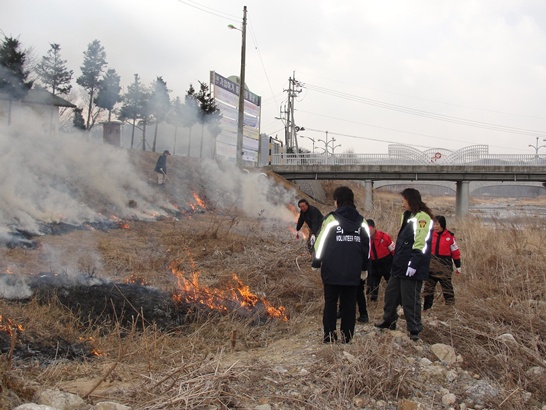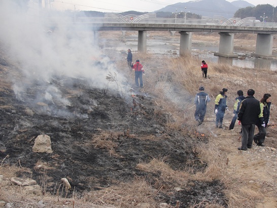 하천둑주변 잡초 와 해충제거 를 위해 하천둑 불태우기 정화작업을 펼쳤습니다.