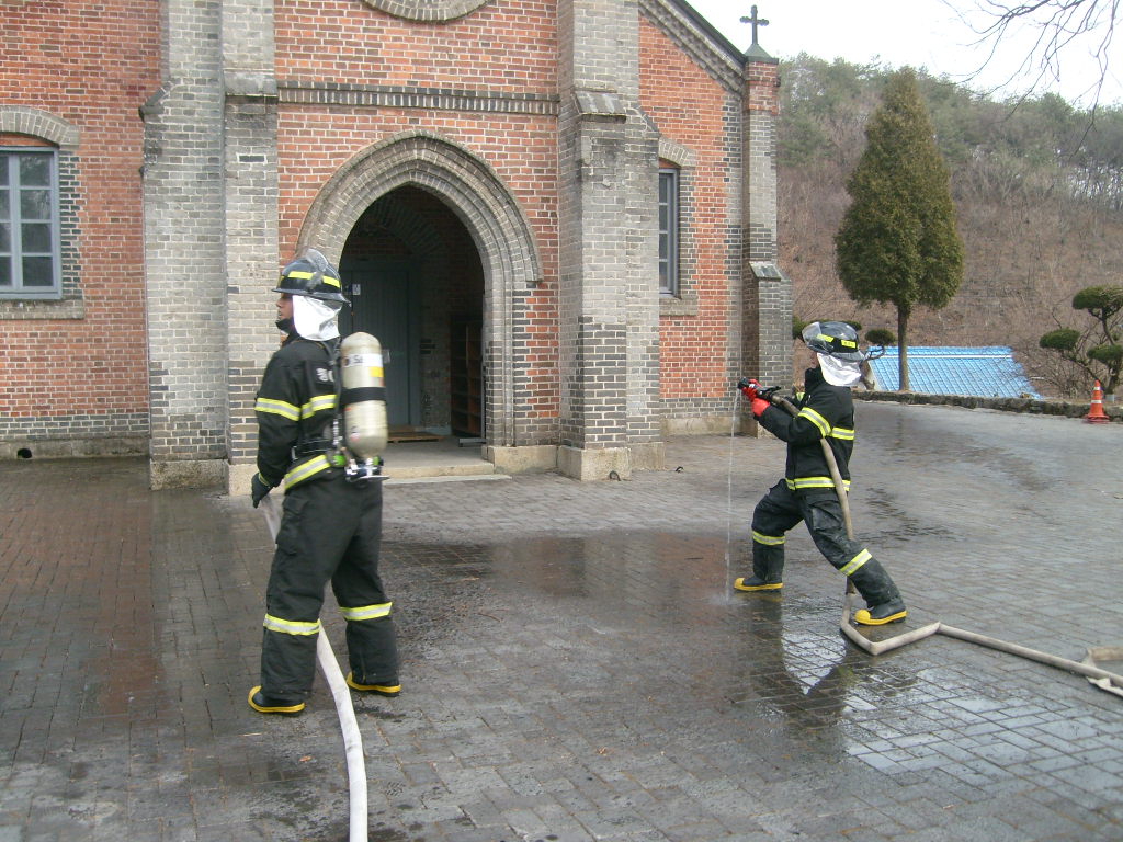 우리소방서(서장 : 조근희) 횡성119안전센터에서는 3. 21(월)14:00 문화재ㆍ전통사찰 및 산불진압 훈련을 서원면 풍수원 성당에서 실시하였습니다. 센터장 외 4명은 횡성펌프1호, 서원펌프을 이용하여 각 소방호스2본을 연결하여 방수을 하였고, 또한 유현지역대(의용)10명과 유관기관으로는 서원 면사무소 관계자가 참여하여 산불로부터 우리횡성 문화재인 풍수원성당을 방호하기 위해 합동훈련을 실시하였습니다.