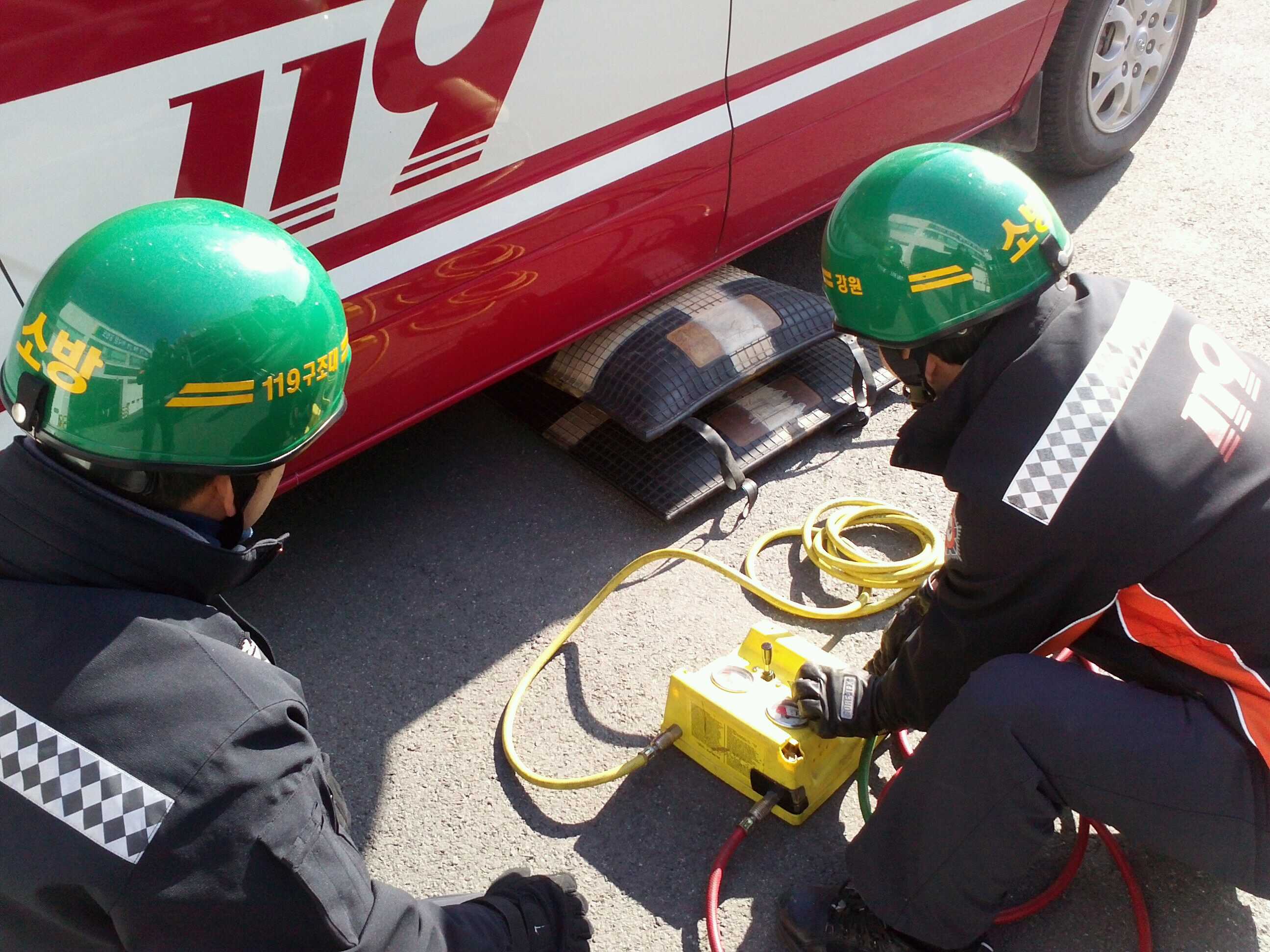 교통사고의 경우 인명피해가 큰 경우가 대부분으로 신속한 구조만이 소중한 생명을 구할수있다. 또한 차량과차량, 차량안이나 차량?에 사람이 있는경우가 있으므로 이번 훈련은 구조대에서 운영하고있는 차량용 에어백 세트를 이용하여 차량을 들어올기고 요구조자를 구조하는 훈련을 실시했다.