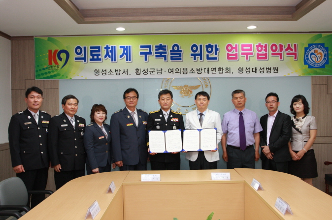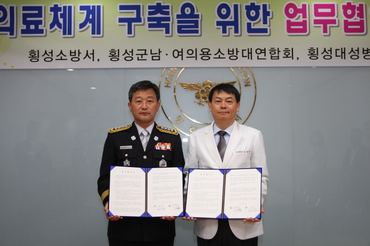 횡성소방서(서장 정은철)는 22일 오전 11시 횡성대성병원(원장 신형철)과 소방서 2층 회의실에서 의료지원에 관한 업무협약식을 가졌습니다.