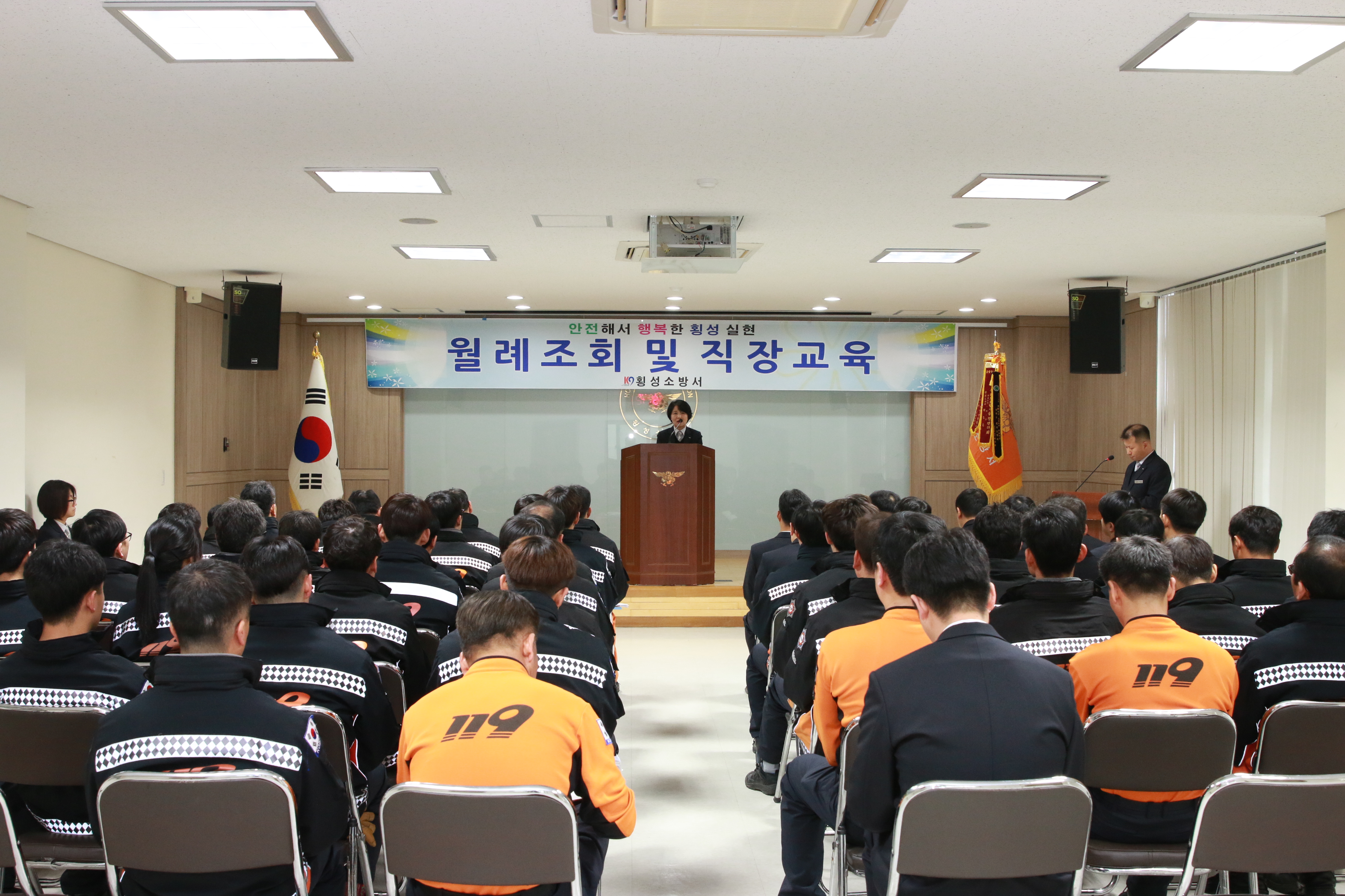 횡성소방서(서장 원미숙)는 7일 9시 횡성소방서 대회의실 3층에서 직원 80여명이 참석하여 월례조회 및 직장교육을 실시했다. 교육 내용은 공직자 청렴 교육, 음주운전 근절 교육, 보안 교육 등이었으며