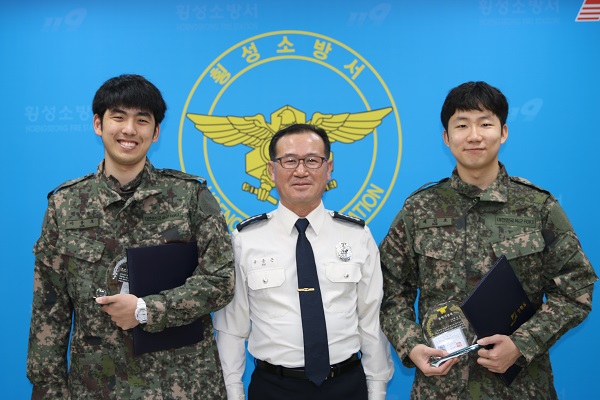 유중근 횡성소방서장은 28일 대회의실에서 의무소방대 수방 배진호, 이용호에 대한