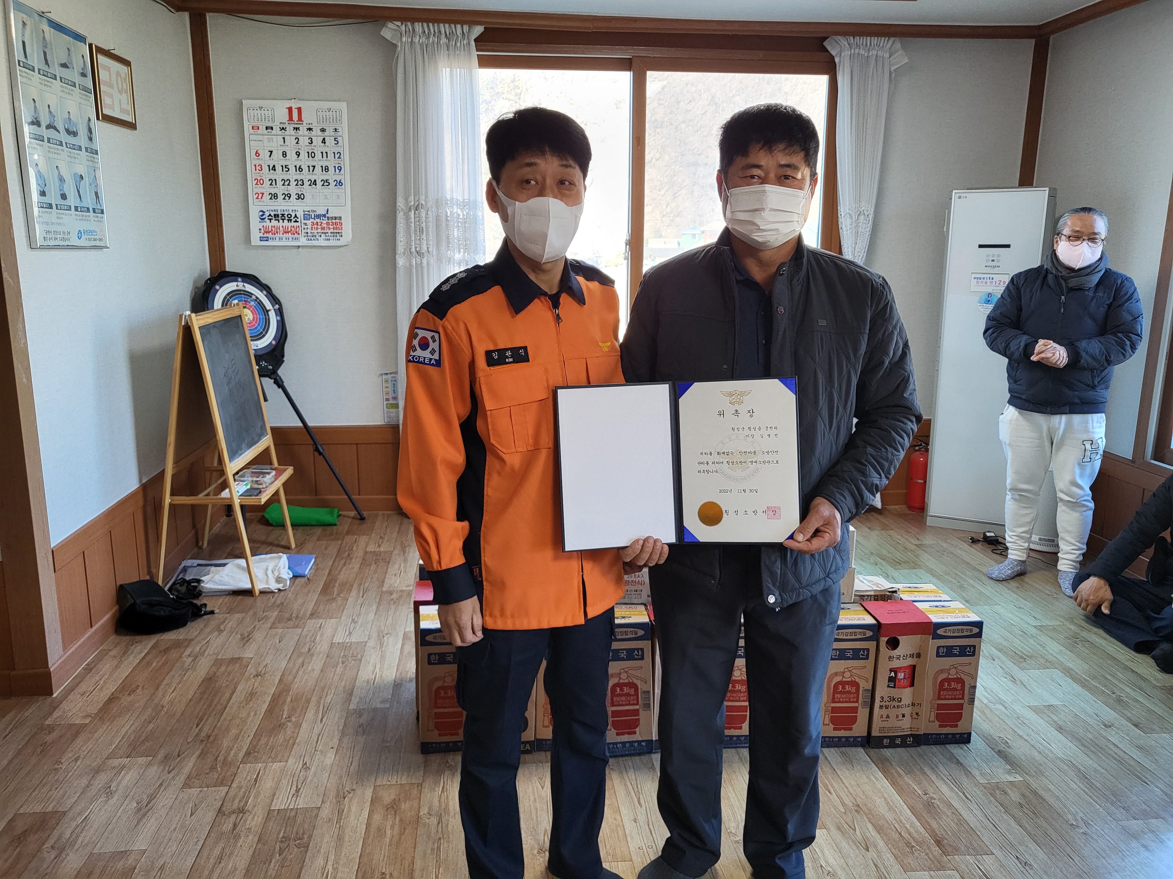 금일 행사는 △ 주택용 소방시설 기증식 및 이장 명예소방관 위촉 △ 마을주민 주택용 소방시설 사용법 및 소방안전교육 △ 주택용 소방시설 희망가구 방문설치 등이며 주택용소방시설은 횡성시민안전관리협의회의 지원과 복권기금 활용하였습니다!