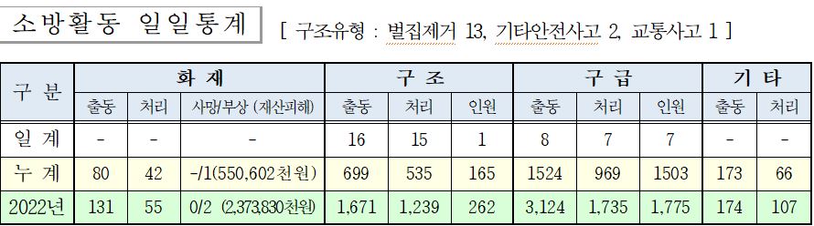 ○ 구조 16건(벌집 13, 기타안전사고 2, 교통사고1)