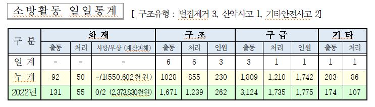 ○ 구조 6건(벌집 3, 산악사고 1, 기타안전사고 2)