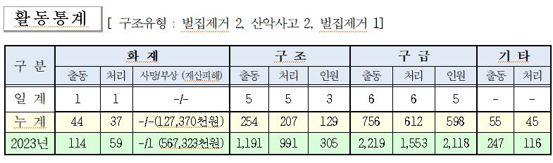 ○ 구조 5건(벌집제고 2, 산악사고 2, 벌집제거 1)