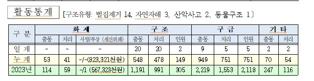 구조 20(벌집제거 14, 자연재해 3, 산악사고 2, 동물구조 1)