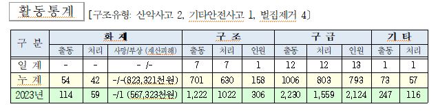 ○ 구조 7건(산악사고 2, 기타안전사고 1, 벌집제거 4)