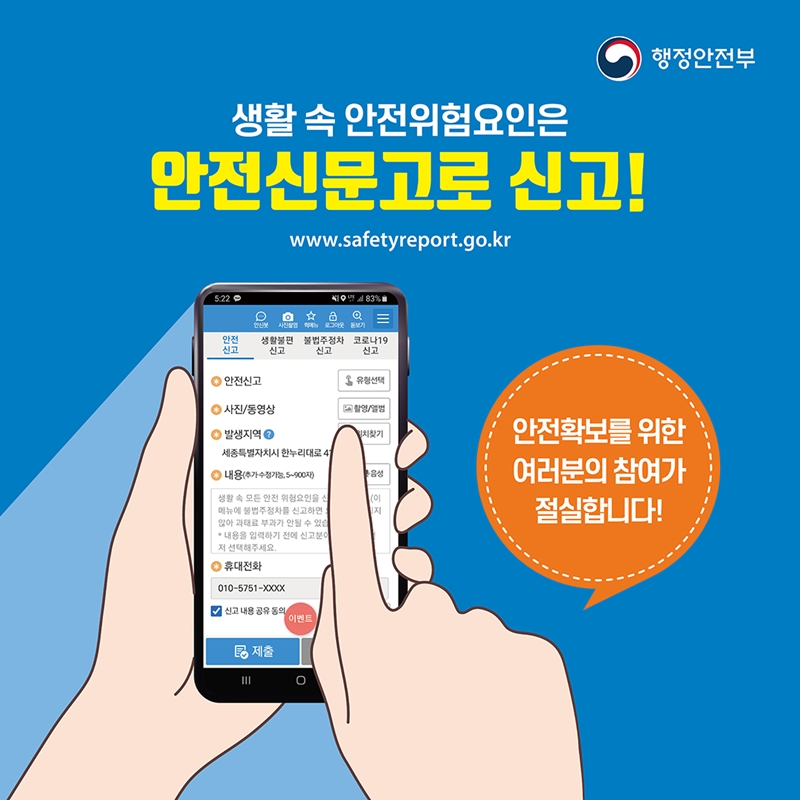 - 참여방법: ① '내 집 스스로 점검하기' , '생활 속 위험요인 신고하기' ② 다중이용시설 관계자는 내 건물과 업소를 안전점검표를 통해 점검하고 결과 게시