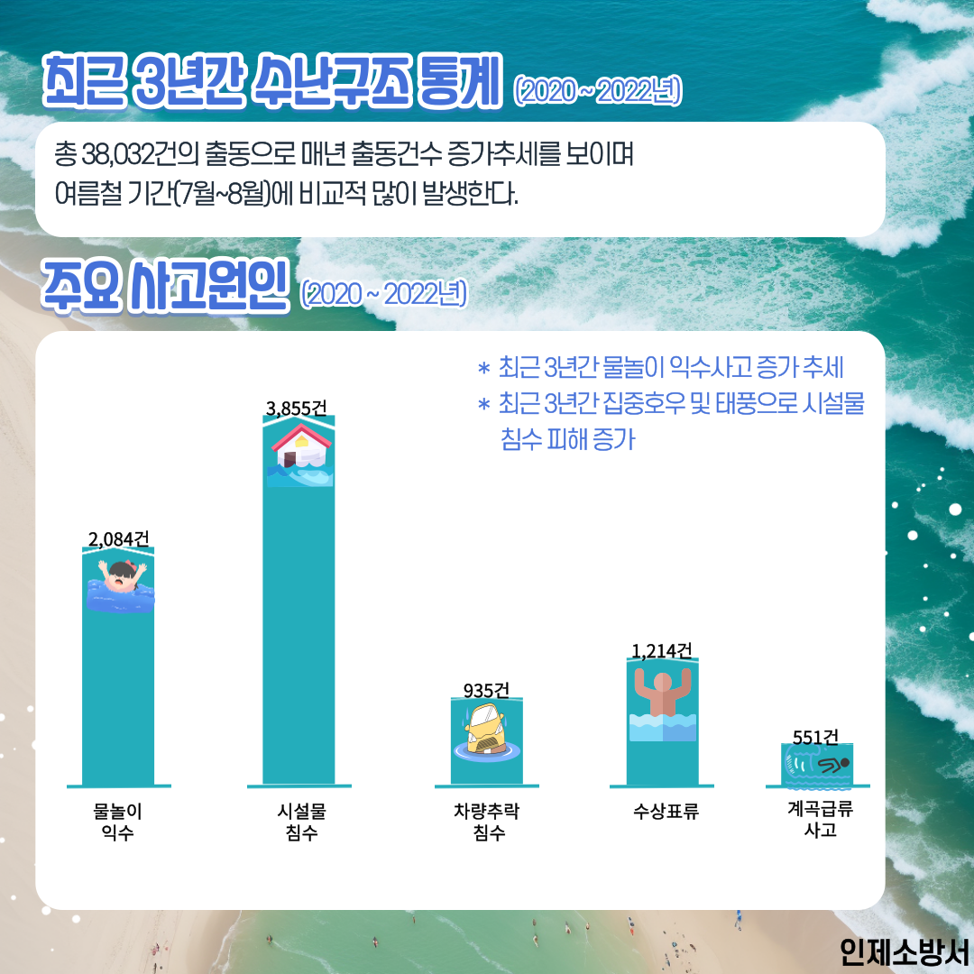 ▲시설물 침수 ▲물놀이 익수 ▲차량추락/침수 ▲수상표류 ▲계곡급류 사고 등이 있습니다.