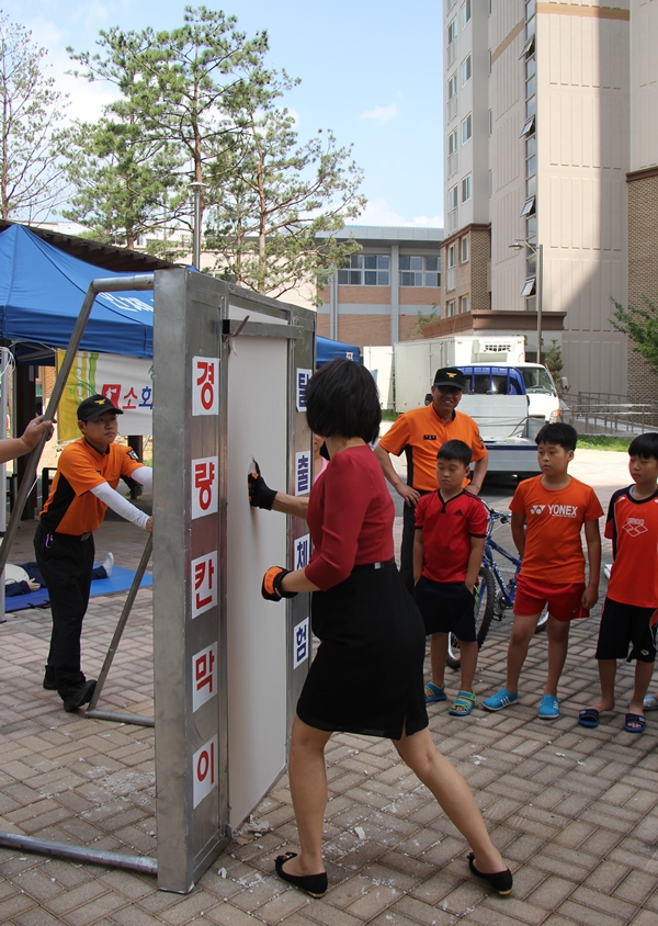 이번 경량칸막이 시연회는 아르미소아파트 입주민이 직접 참여하여 발차기(운동화착용) 등 성인남자, 성인여자, 어린이 등 연령별로 탈출 시연을 하였고, 소소심 캠페인 및 체험장을 운영하며 119신고확대서비스 및 소방차 길터주기 홍보도 병행 실시하였다.