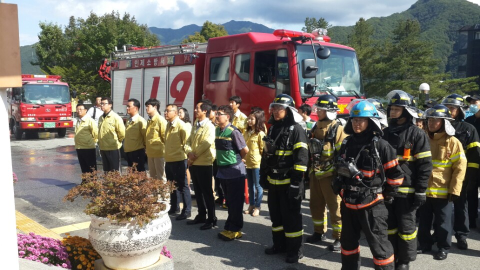 9. 25일 14시 인제군청에서 공공기관 합동 소방훈련을 실시하였습니다.
