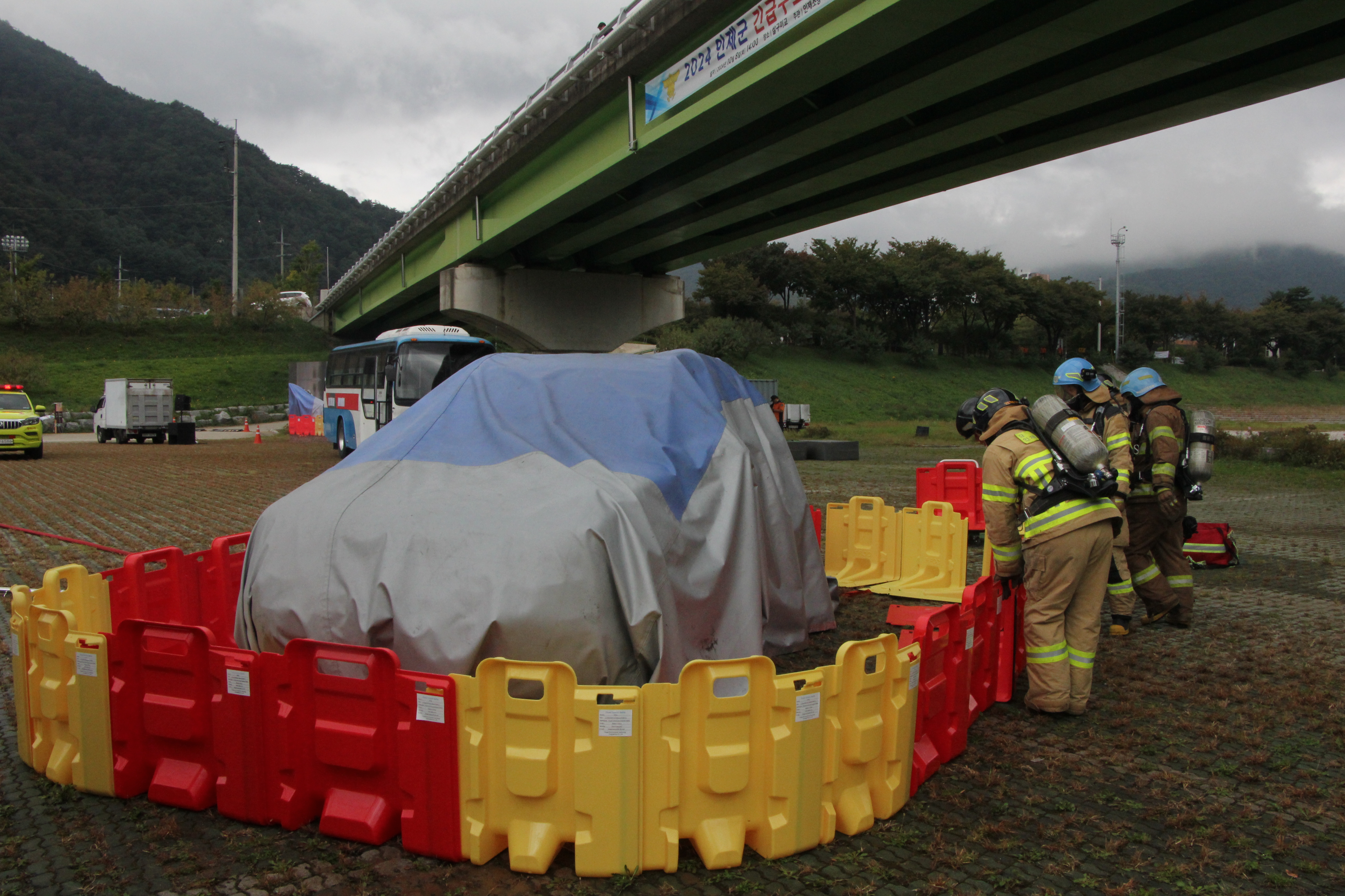 이번 훈련은 살구미교에서 버스와 정차 중인 승용차량이 추돌·추락한 상황을 가정하였으며, 전기차량화재 및 다수 사상자 대응에 초점을 두었다.