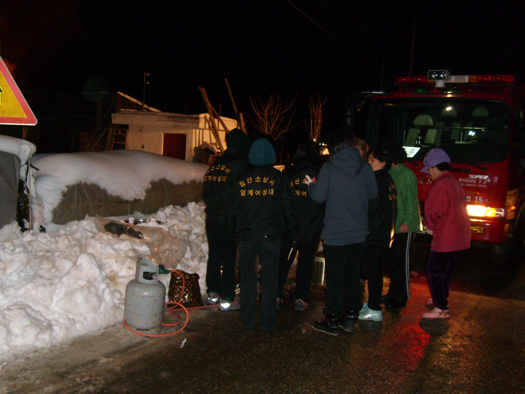 정선소방서(서장 우원기) 임계여성의용소방대(대장 유춘란 외 19명)는 3월 3일 임계면 가목리 화재현장에 도착하여 화재진압하는 소방대원과 의용소방대원 및 화재피해주민에게 강추위에도 불구하고 현장에서 따뜻한 라면과 커피를 준비하였습니다.
