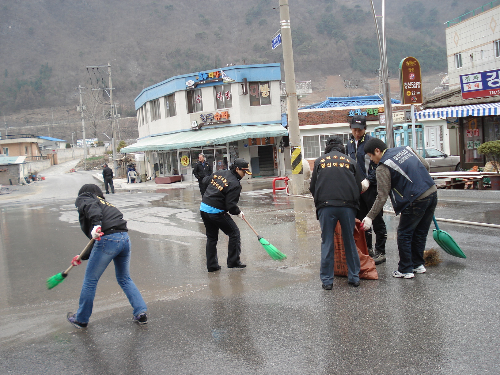 정선 여성대 대장 (장순자) 는 4월 10일 오전 6시부터 정선 5일장 개장을 앞두고 관광객 맞을 시장안.공설운동장 입구 .정선역및 광장을 남성대와 여성대가 단합하여 깨끗한 정선을 만들기위하여 물청소를 실시하였읍니다.
