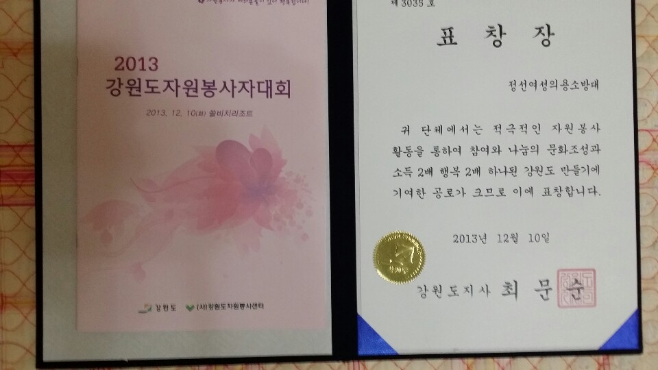 정선여성의용소방대에서는 12월 10일 2-13년 강원도 자원봉사자대회(양양군 쏠비치)에서 봉사단체상을 수상하였다.
