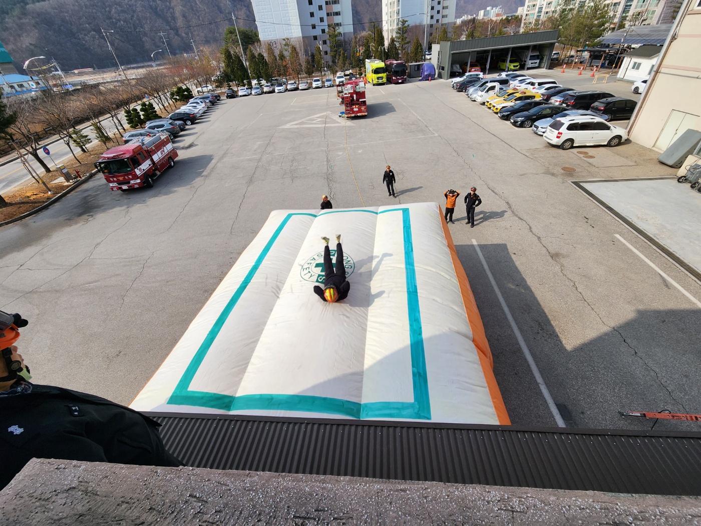 ➤ 이번 훈련은 에어매트 설치와 조작 방법 숙달로 현장 대응능력과 안전한 구조능력을 향상하고자 마련됐다. 주요 내용은 ⯅에어매트 외관 및 기능 점검 ⯅신속한 에어매트 전개 ⯅에어매트 사용 시 주의사항 ⯅안전 사고 방지 교육 등이다.