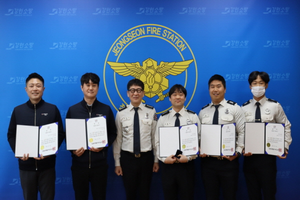 정선소방서(서장 최영수)는 8일 10시 심폐소생술로 소중한 생명을 살리는 데 결정적으로 이바지한 소방장 김병성, 소방교 박형준, 소방사 이승준 그리고 강원랜드 직원 김익현, 강윤혁씨에 대해 하트세이버 인증서를 수여했다고 밝혔다.