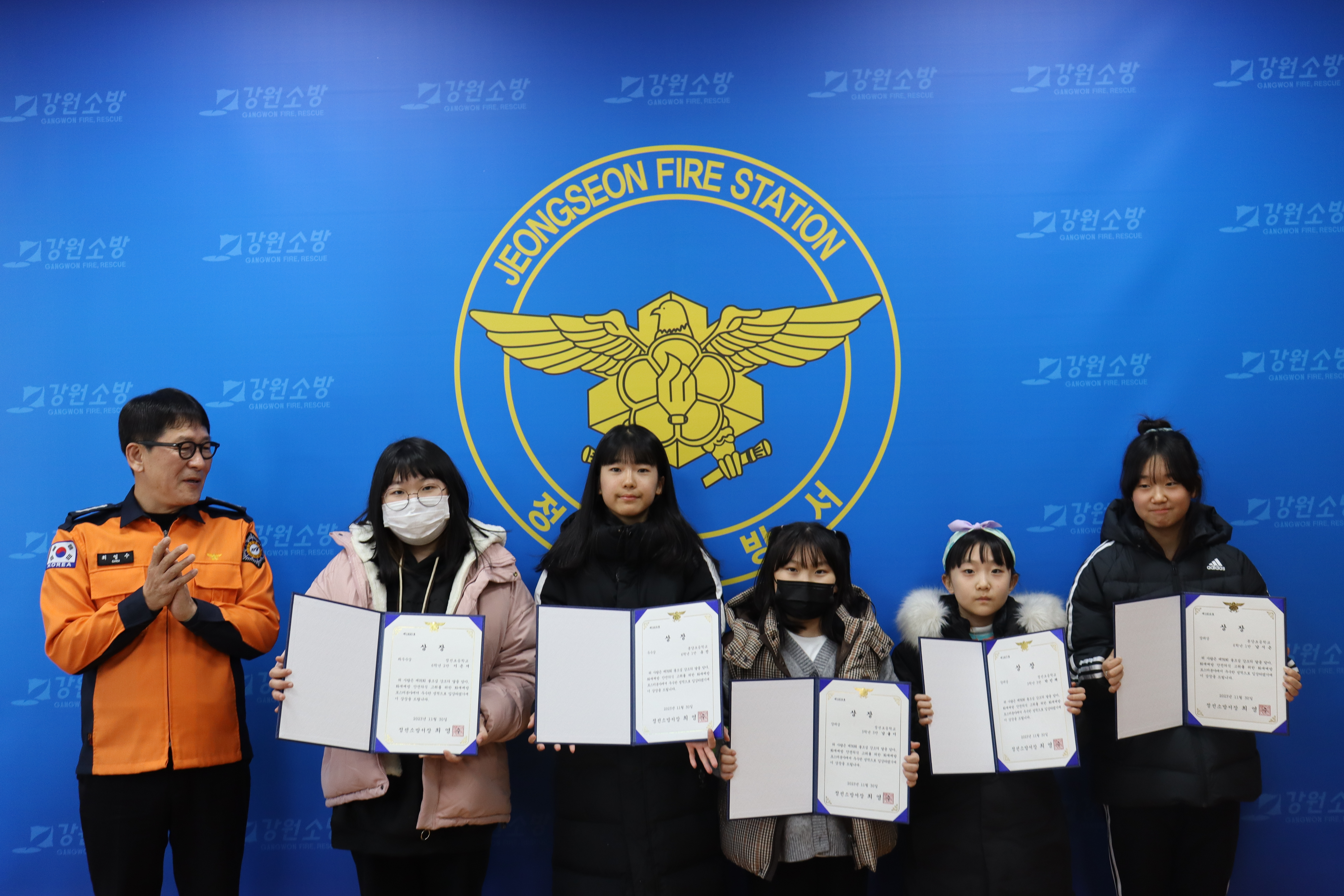 ➤이번 시상식은 소방서장 훈격으로 최우수ㆍ우수상ㆍ장려상 수상자들이 참여한 가운데 진행됐다. 최우수상은 정선초등학교 이은서 학생, 우수상은 봉양초등학교 윤진, 장려상은 봉양초등학교 남율이, 박민채 학생, 정선초등학교 남시은 학생에게 수여됐다.
