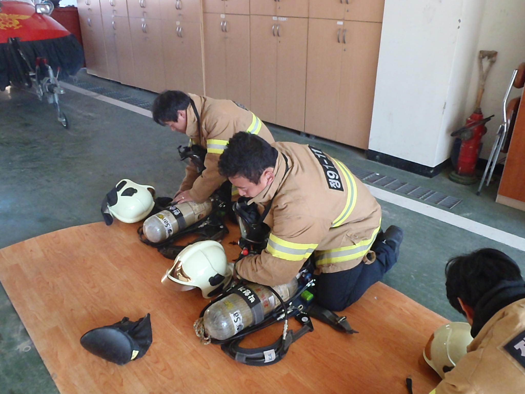 119 구조대는 금일 현장활동 표준기법 훈련중 공기호흡기 착용 숙달훈련을 실시 했습니다. 평소 쉽게만 생각했던 공기호흡기 착용법. 교범데로 하려니 마음은 급하고 손은 느리고 어리둥절 하는 모습이 너무나도 눈에 많이 띄었습니다. 하지만 우리가 누구 안되면 잘 될때까지~! 반복숙달을 여러번 하고나니 이제는 몸도 마음도 가볍게 공기호흡기와 혼연일체가 되었답니다.