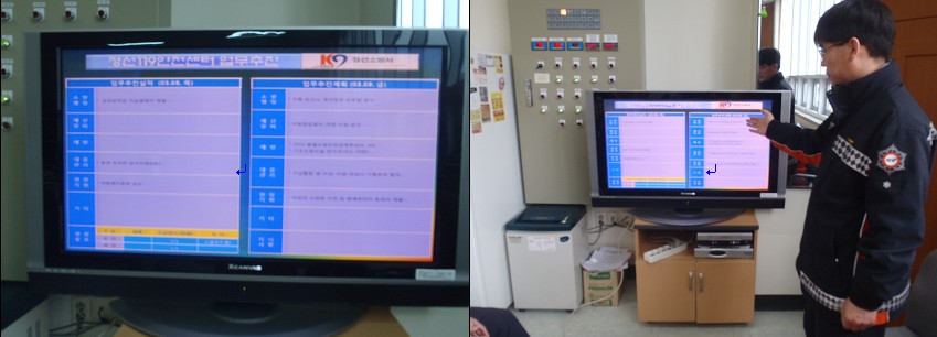 정선소방서(서장 박창진) 정선119안전센터에서는 센터 내 설치 된 PDP TV모니터를 활용하여 출동대 편성확인, 업무인수인계 및 공기호흡기 충전기한을 확인하는 용도로 사용해 업무의 질을 높이고 변하는 시대에 맞쳐 변해가는 소방인이 되고자 합니다.