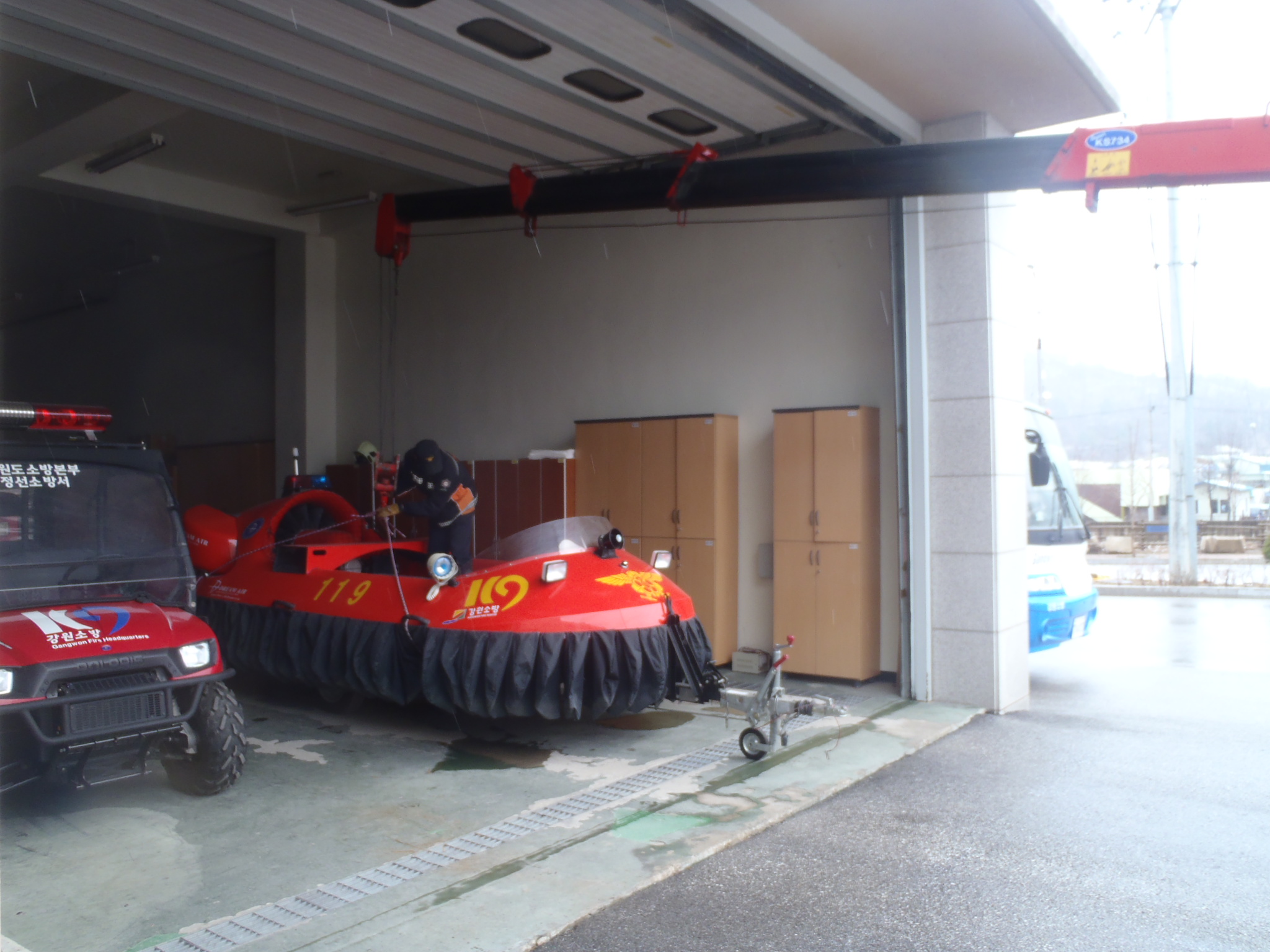 정선소방서(서장 박창진) 119구조대는 금일 호버크래프트 정밀 점검을 시작했습니다. 시동점검 및 손상된 스커트를 보완했고 트레일러 탈결착 훈련을 하였습니다.