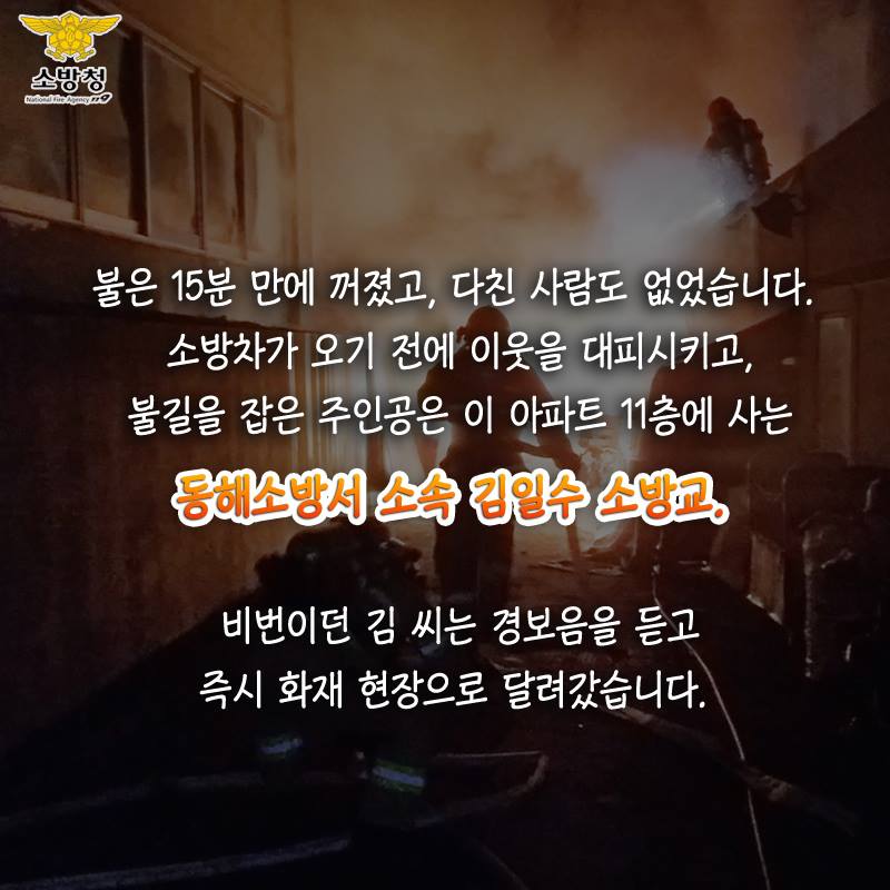 아파트에서 화재발생 비번인 소방관이 막았다.3