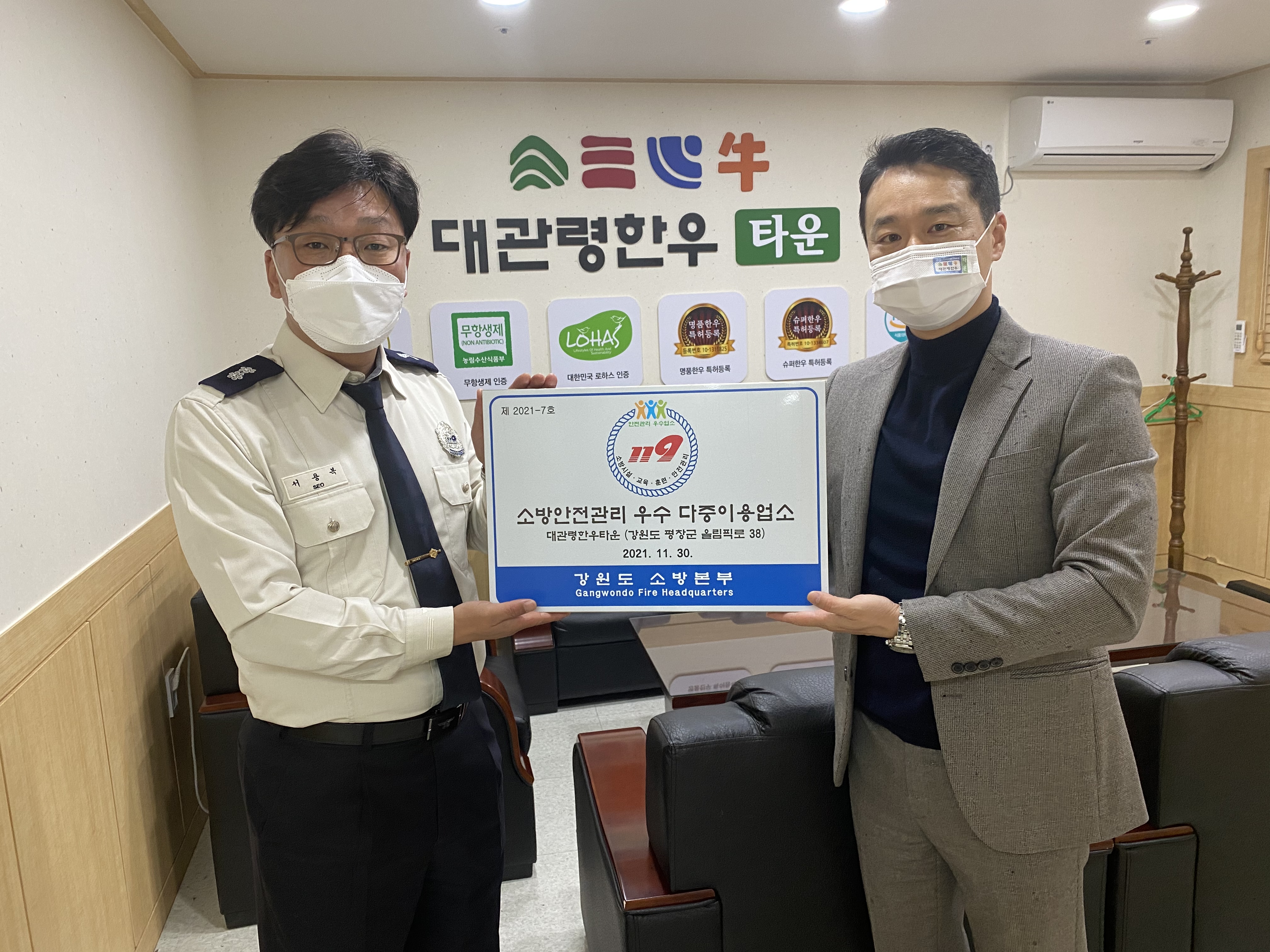 평창소방서(서장 최영수)는 30일 대관령면 올림픽로 소재 평창대관령한우타운을 2021년 다중이용업소 안전관리 우수업소로 선정하고 인증 현판식을 가졌다고 밝혔다.