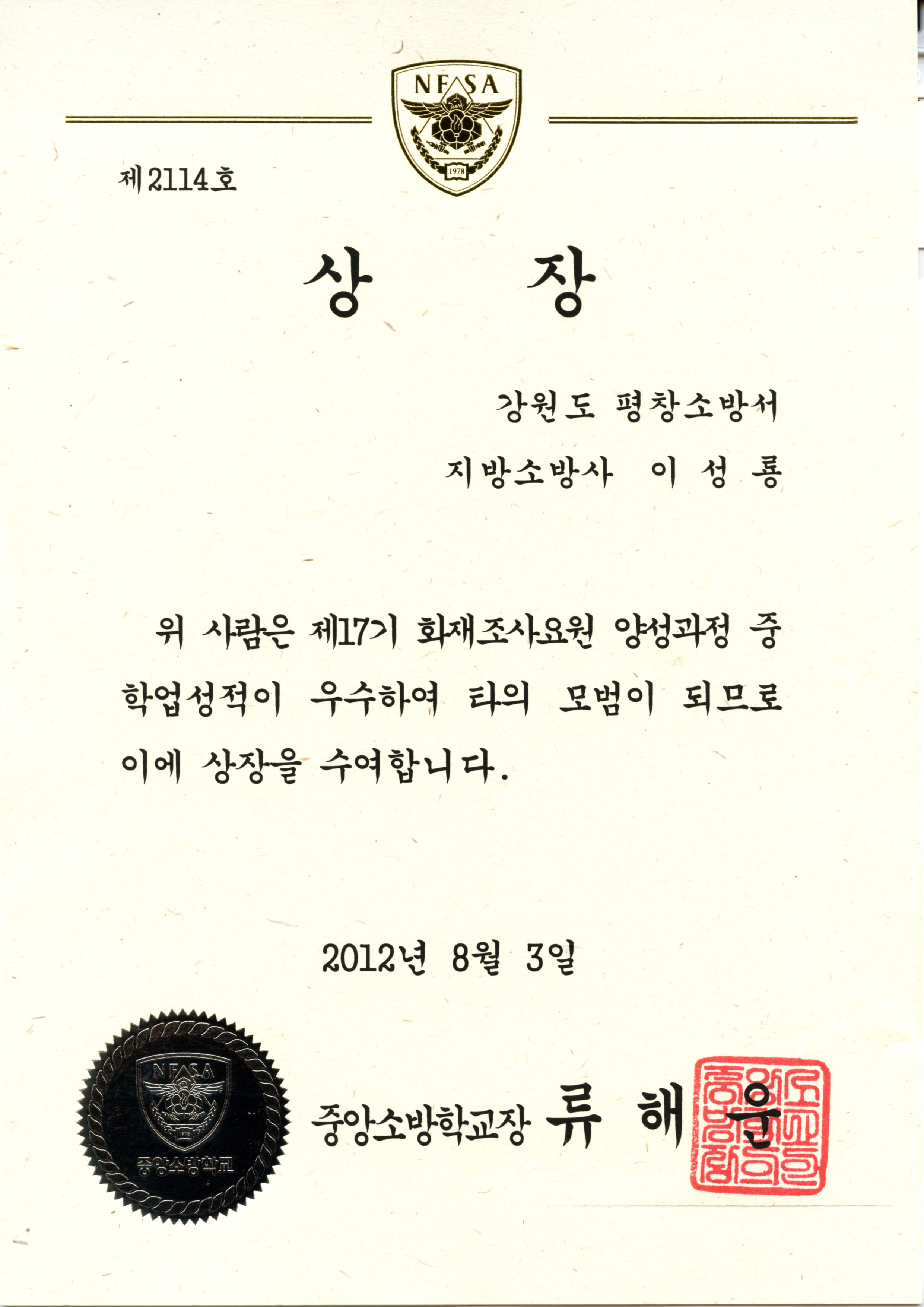 | 74 | 언빌리버블한 소식~ 소방사 이성용 화재조사 요원 양성과정 우수상 수상 | 예방 | 2012-08-03 | 672 | |