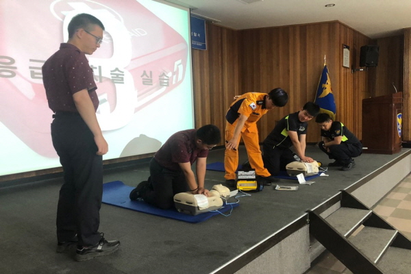 인명구조 활동 역량강화를 위하여 ▲심폐소생술 이론 및 실습교육 ▲AED 사용방법 ▲하임리히법 실시방법 ▲골절, 벌 쏘임, 온열질환자 대처방법 등 현장 대처 중심으로 다양한 교육을 진행하였습니다 ^^
