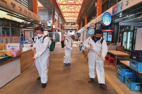 평창소방서 평창남성의용소방대(대장 함승주)는 신종 코로나 바이러스 감염증(코로나19) 확산 방지를 위해 평창터미널과 평창올림픽 시장 등을 대상으로 방역활동을 추진하고 있다.