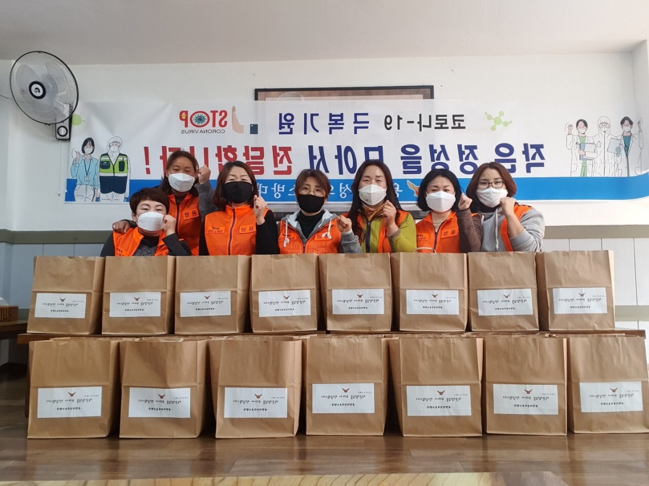의용소방대원들은 코로나19에 대비하여 개인마스크를 착용하고 비대면으로 라면과 순댓국밥 등의 음식을 전달한다.