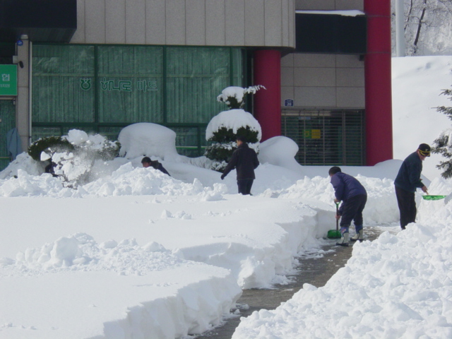 13일 대장외14명은 12일과같이 트렉터및 대원 중장비 3대및 트렉터 2대 총5대동원 면 제설작업에 참여하였읍니다.