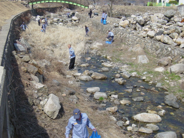 신기의용소방대 자매 마을 고무릉리 임종혁 대장외 15명은 자매마을 고무릉리 마을 소하천 쓰레기줍기 봉사활동을 31일 오전10시부터 오후까지 봉사활동 모습