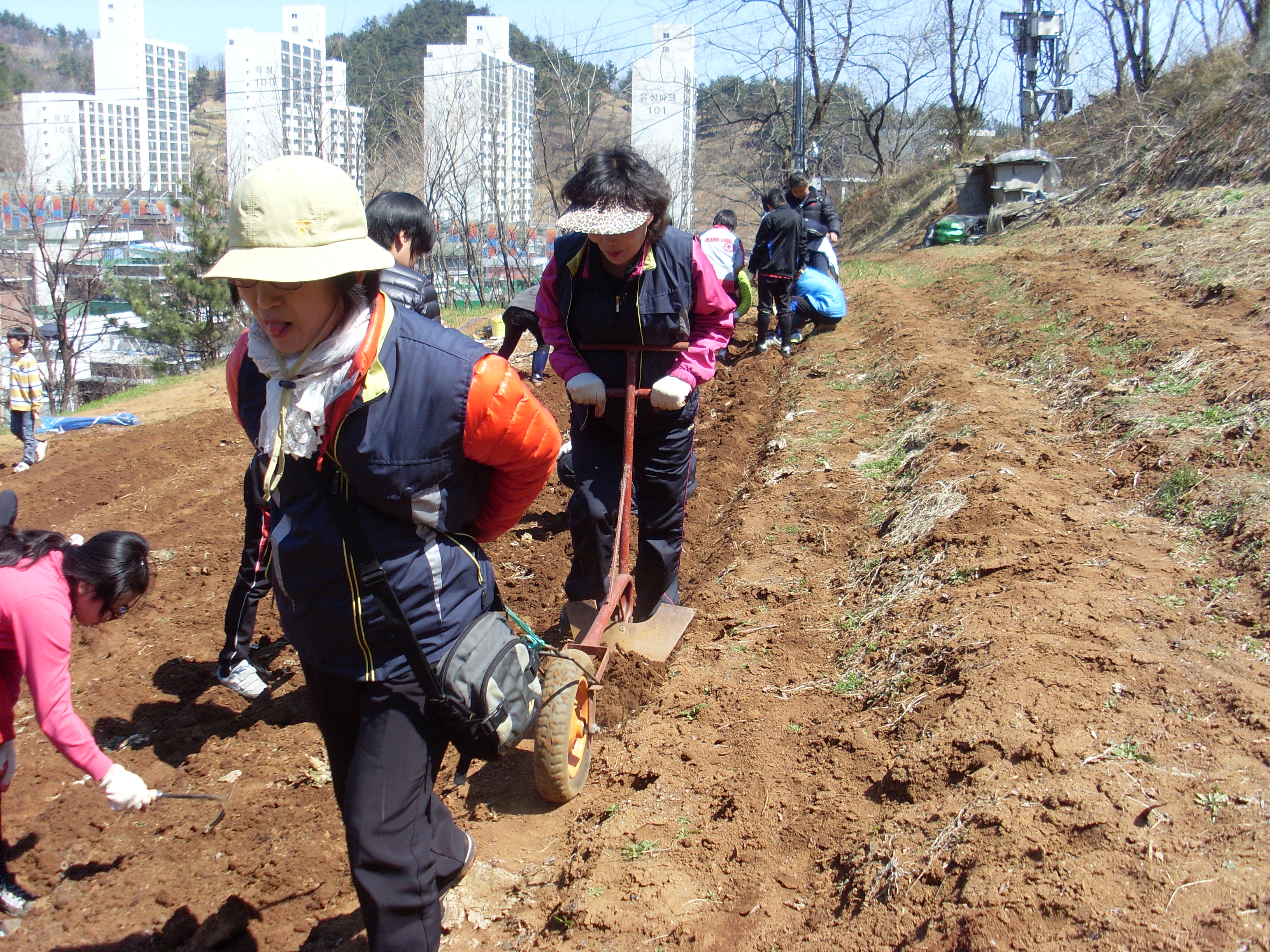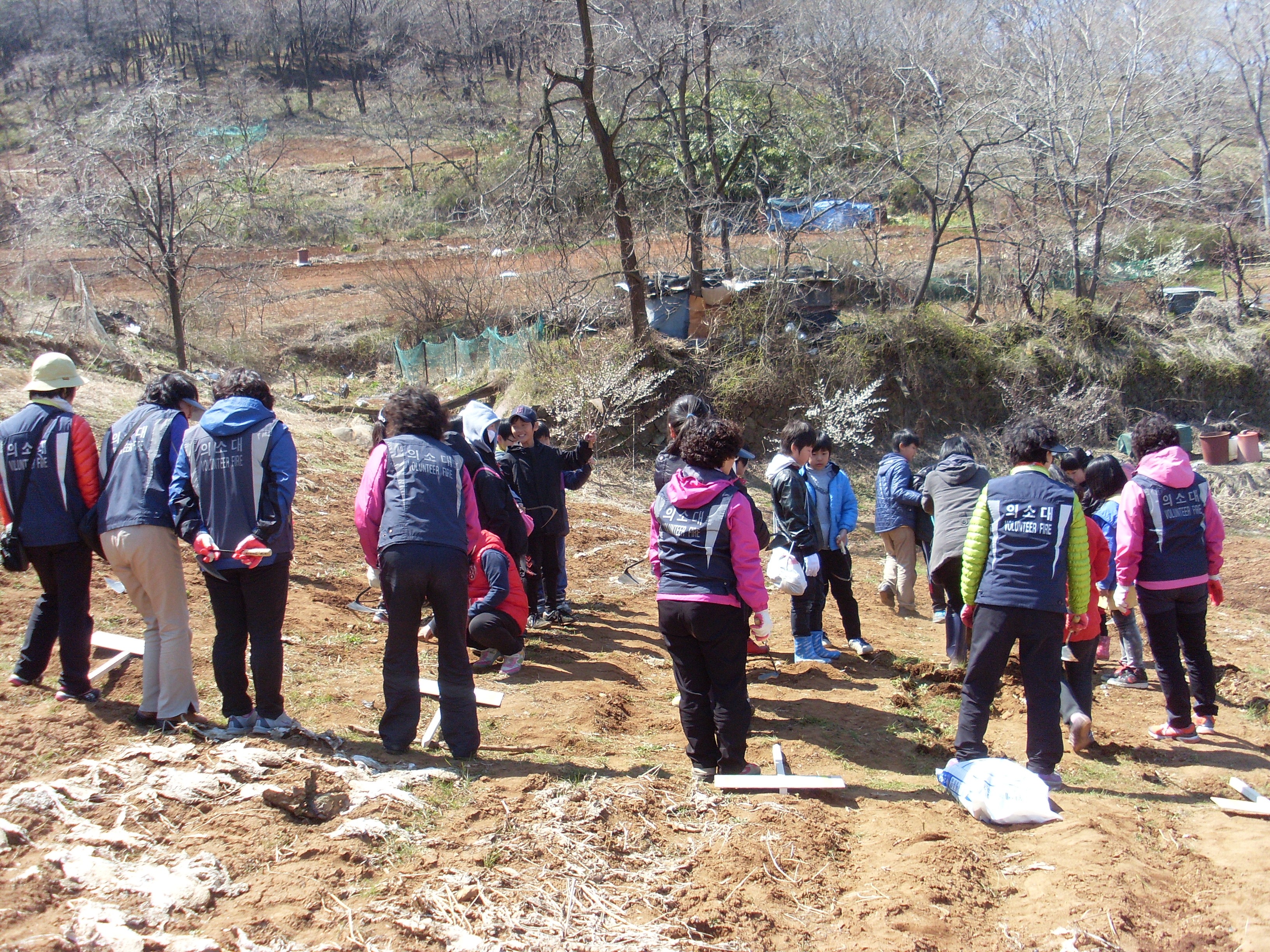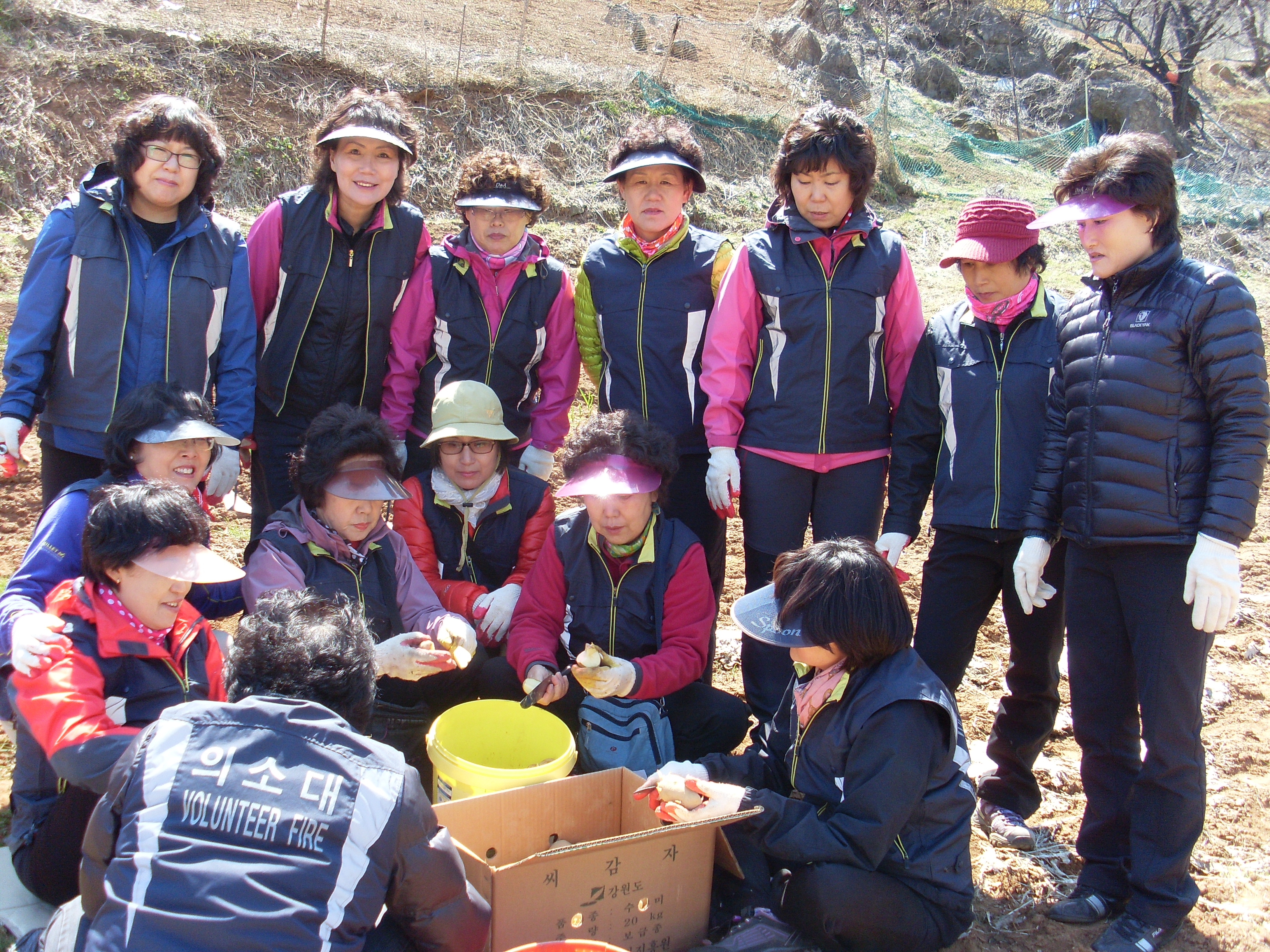 4월7일 토요일 봉황산 입구 밭에서 청소년수련관 선생님4명 초등학생 40명과 대원20명 함께 비닐 덥고 구멍 뚫어서 감자 심기 체험을 하엿습니다. 대원분들 몸살나지 않앗는지요. 말썽꾸러기들 데리고 하시느라 애쓰셧습니다.