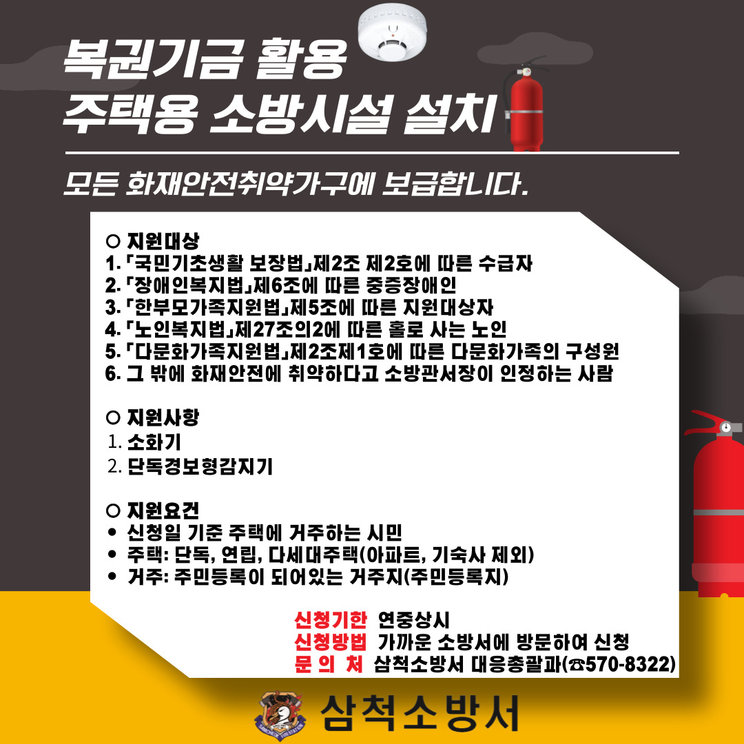 | 889 | 복권기금 활용 주택용 소방시설 신청 홍보 | 삼척홍보 | 2024-10-17 | 563 |