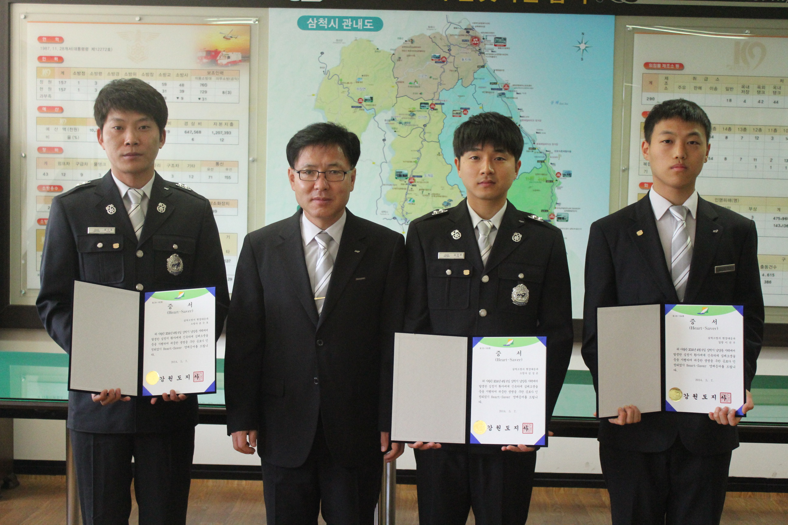 2014년 5월 12일 오전 9시 서장실에서 구급대원 3명에게 하트세이버 배지와 증서를 수여하였다.