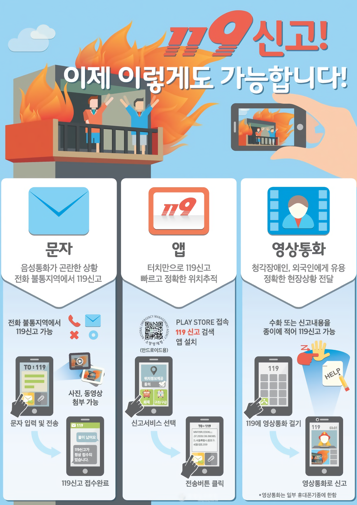 이에 국민의 다양한 수단에 의한 신고권을 보장하는 차원에서 ‘영상, 문자(SMS, MMS), 앱’ 등의 다양한 방식으로 119 신고를 할 수 있는 신고 서비스를 마련하였습니다.