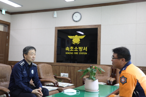 김학봉 강원북부교도소장은 속초소방서장과 환담을 나누고 소방공무원의 노고를 격려했다.
